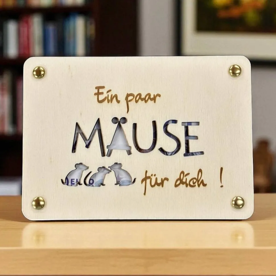 Die feine Gravur, die je nach Motiv teilweise durchgelasert ist, sorgt nicht nur für eine einzigartige Optik, sondern gibt auch den Blick auf das Innere frei – denn zwischen den beiden Holzplatten lassen sich Geldscheine, kleine Gutscheine oder liebe Botschaften platzieren. So wird aus einem einfachen Geldgeschenk eine persönliche, stilvolle und emotionale Geste.