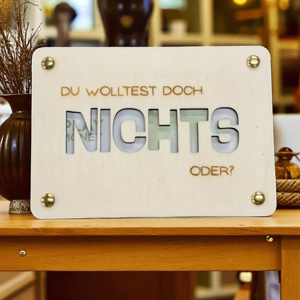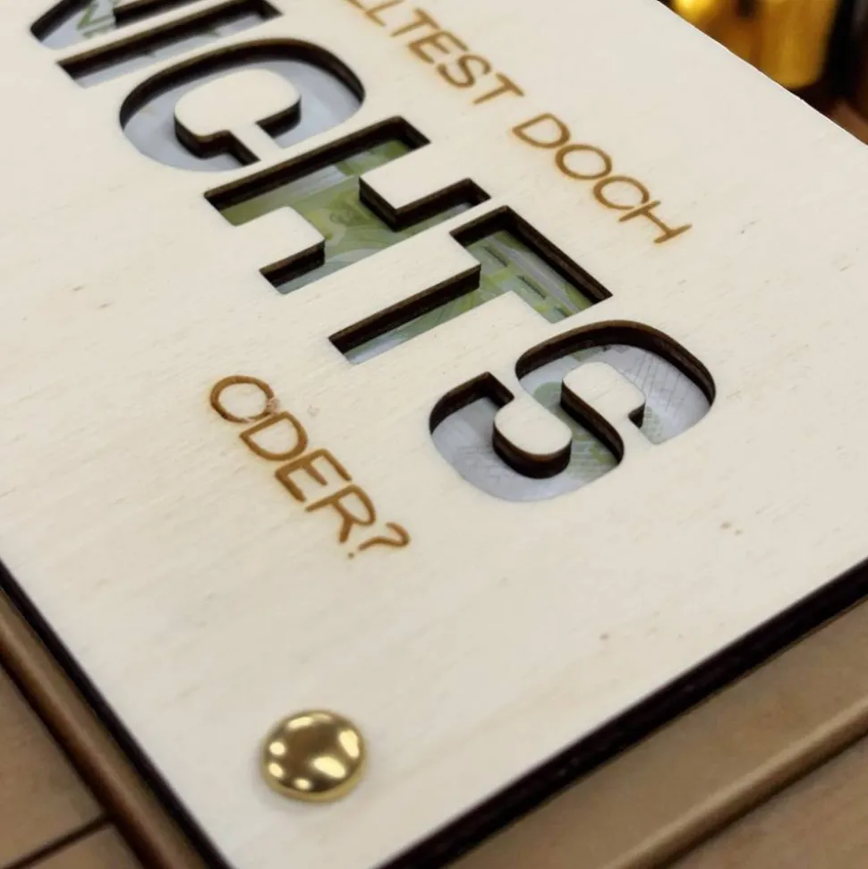 Die feine Gravur, die je nach Motiv teilweise durchgelasert ist, sorgt nicht nur für eine einzigartige Optik, sondern gibt auch den Blick auf das Innere frei – denn zwischen den beiden Holzplatten lassen sich Geldscheine, kleine Gutscheine oder liebe Botschaften platzieren. So wird aus einem einfachen Geldgeschenk eine persönliche, stilvolle und emotionale Geste.