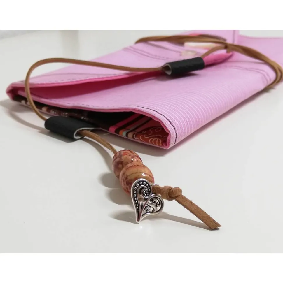 Das Kuvert besteht aus verschiedenen 100% Baumwollstoffen (Auch Herrenhemd) im Patchworkstil. Zusammengehalten wird es von einem Lederband und 2 schönen Holzperlen. Verstärkt mit Vlieseline S320. Meine Stoffe werden vor der Verarbeitung vorgewaschen.