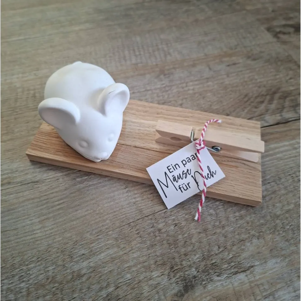 Eine niedliche Maus mit einer Klammer für das Geldgeschenk auf Holz.