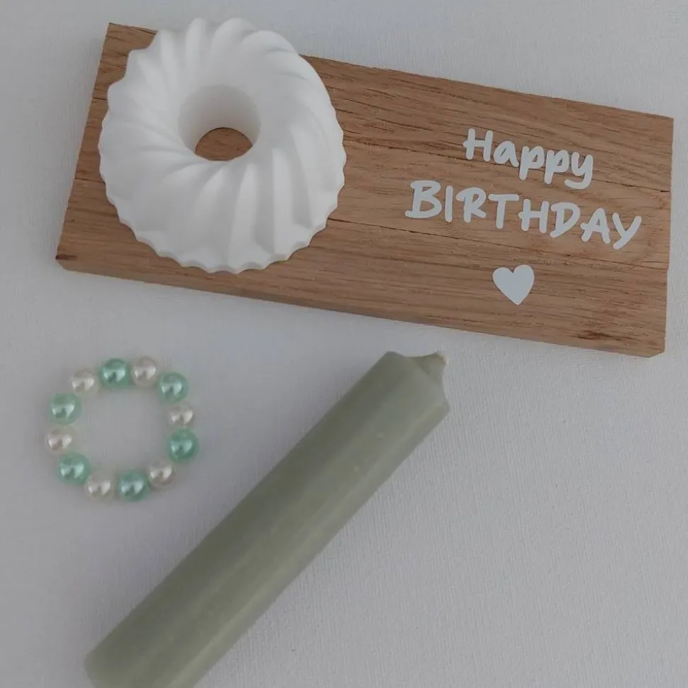 Verschenke Freude zum Geburtstag mit dem exklusiven Geschenkset Happy Birthday! Dieses liebevoll zusammengestellte Set besteht aus einem naturbelassenen Holzbrett mit weißem Aufdruck, einer eleganten Stabkerze, einem dekorativen Perlenring und einem einzigartigen Kerzenhalter in Guglhupfform aus Raysin. Jedes Stück ist handgefertigt und ein echtes Unikat.