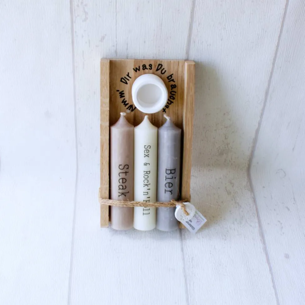 Der schlichte Kerzenhalter aus Raysin/Keraflott ist ca. 3x2cm groß und eignet sich für alle gängigen Stabkerzen/Tafelkerzen. Die drei beiliegenden Kerzen sind ca. 10 x 2,2 cm groß und bestehen aus Stearin. Auf Wunsch kannst Du einen persönlichen Gruß (max. 20 Buchstaben) seitlich auf die stilvolle Holzverpackung anbringen lassen – so wird Dein Geschenk noch persönlicher.