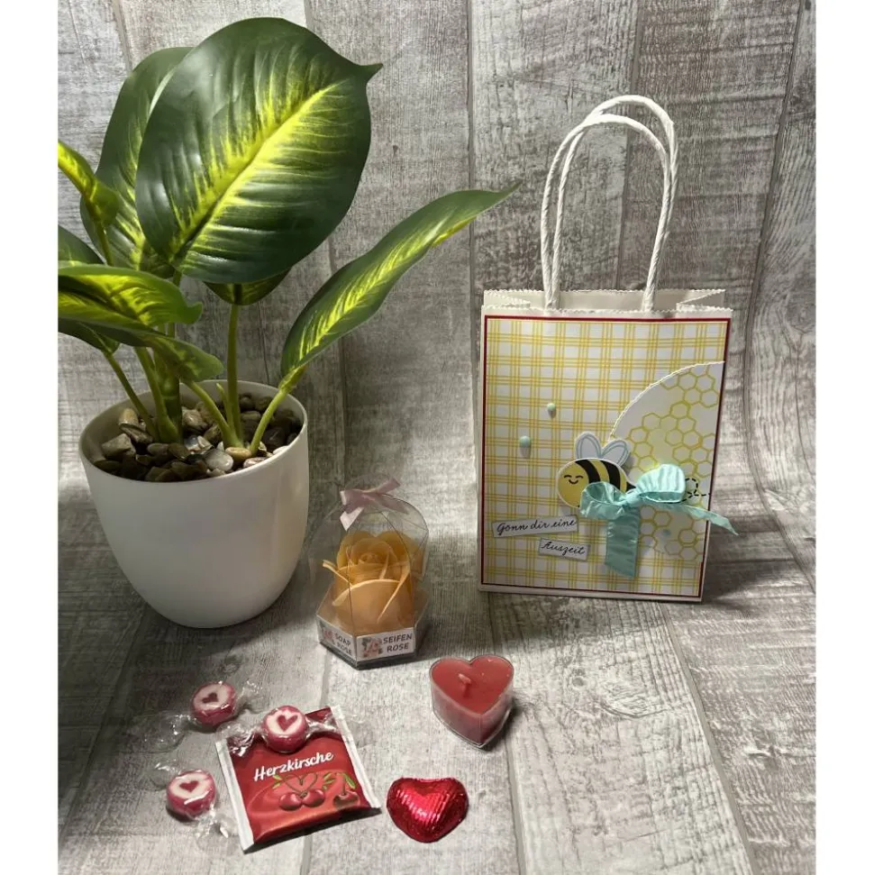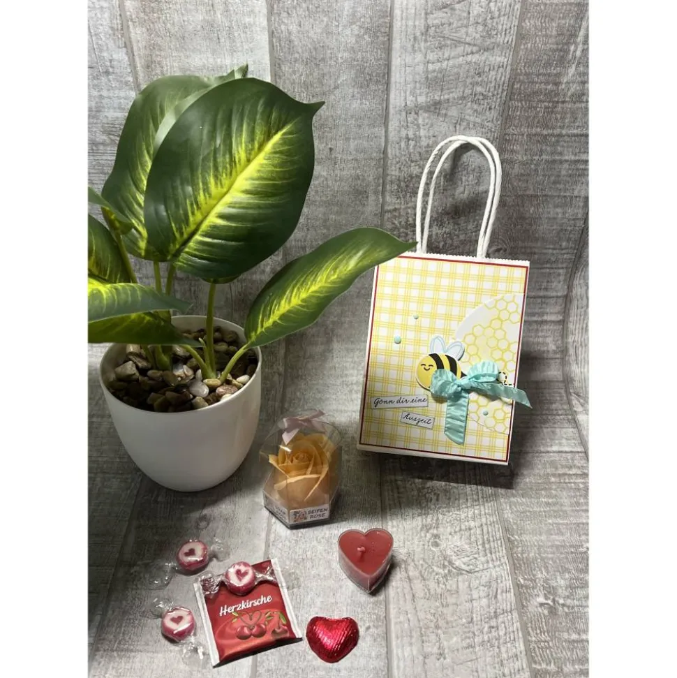 Dann biete ich dir hier dieses Geschenkset. Eine Verpackung in Form einer Tüte, die gefüllt ist mit Kleinigkeiten, für eine „kleine Auszeit“.