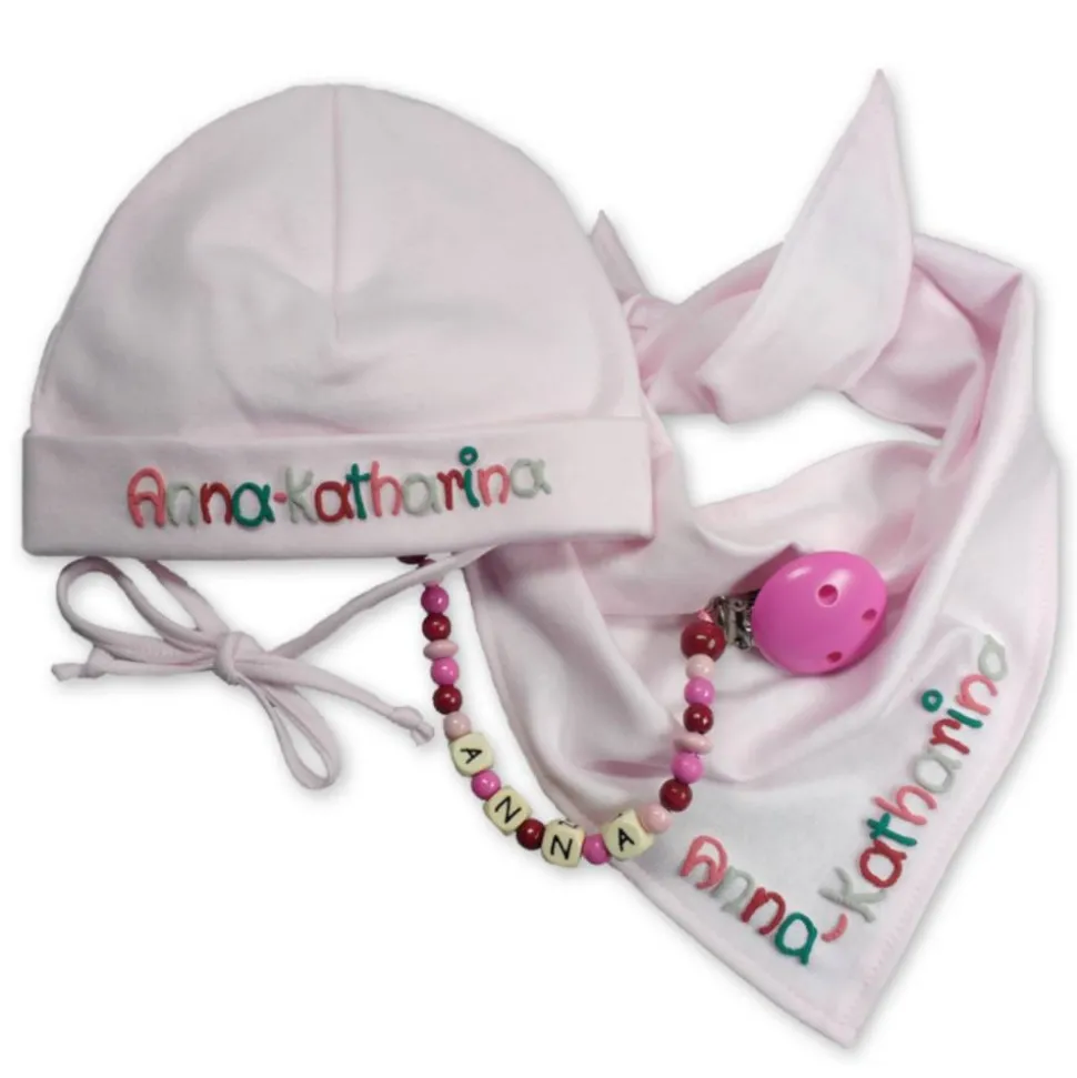 Wärmekissen, Babymütze und Schnullerette sind mit Namen beschriftet und liebevoll im Geschenkkarton verpackt, inklusive Glückwunschkarte. Das beliebte Set gibt es in vier Farben.