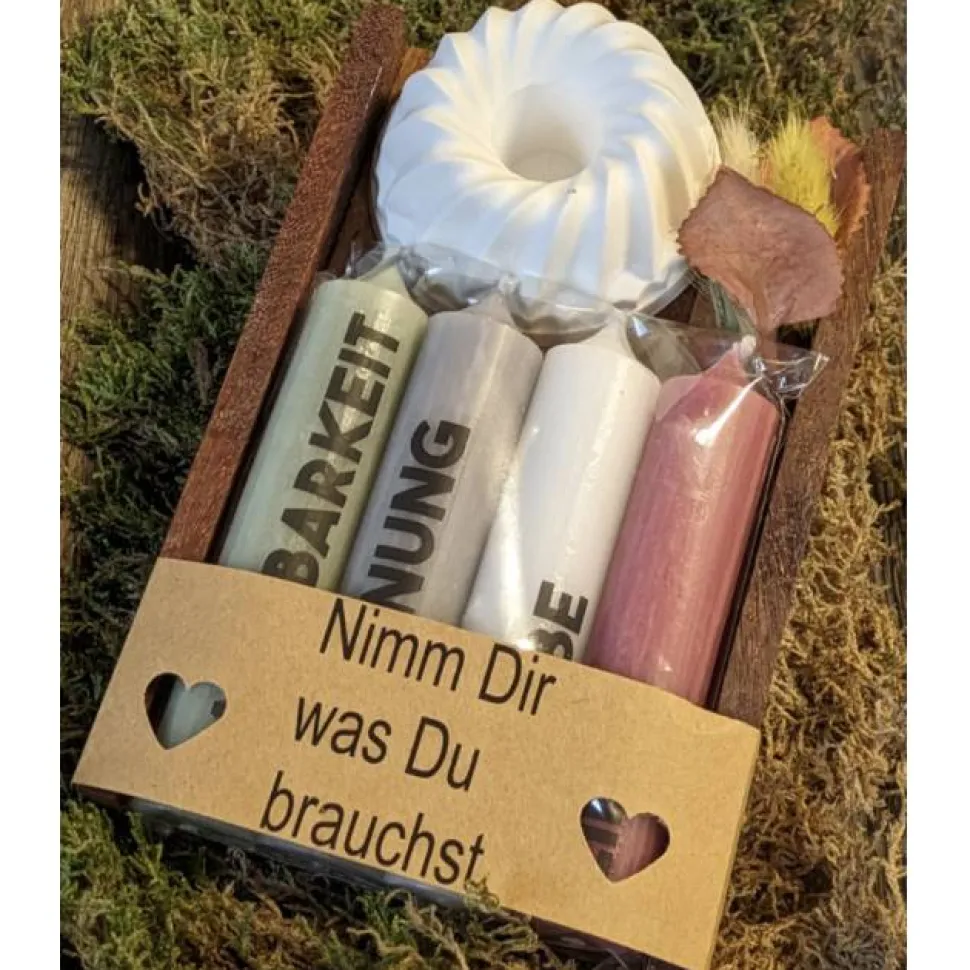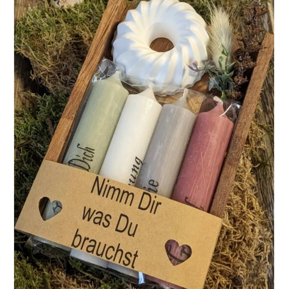 Es besteht aus vier kleinen Kerzen mit Text, und einem Kerzenständer.