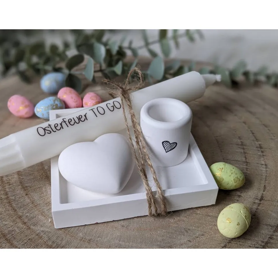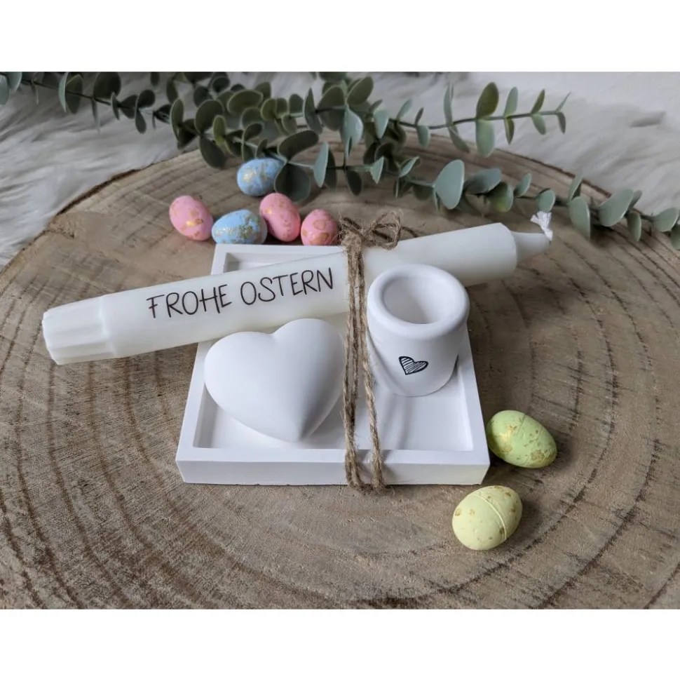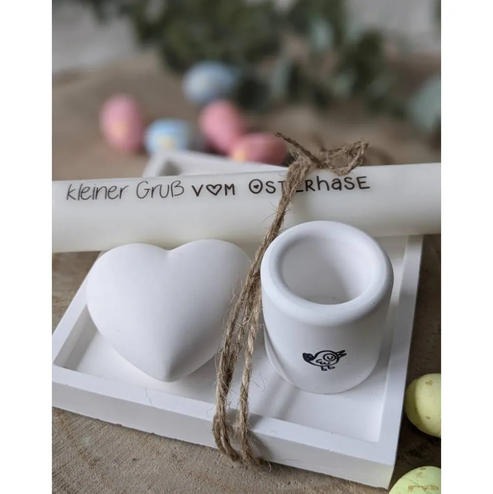 Dieses Geschenk-Set besteht aus einer eckigen Schale mit Kerzenständer, einer Stabkerze mit einem Spruch für Ostern und einem Herz.