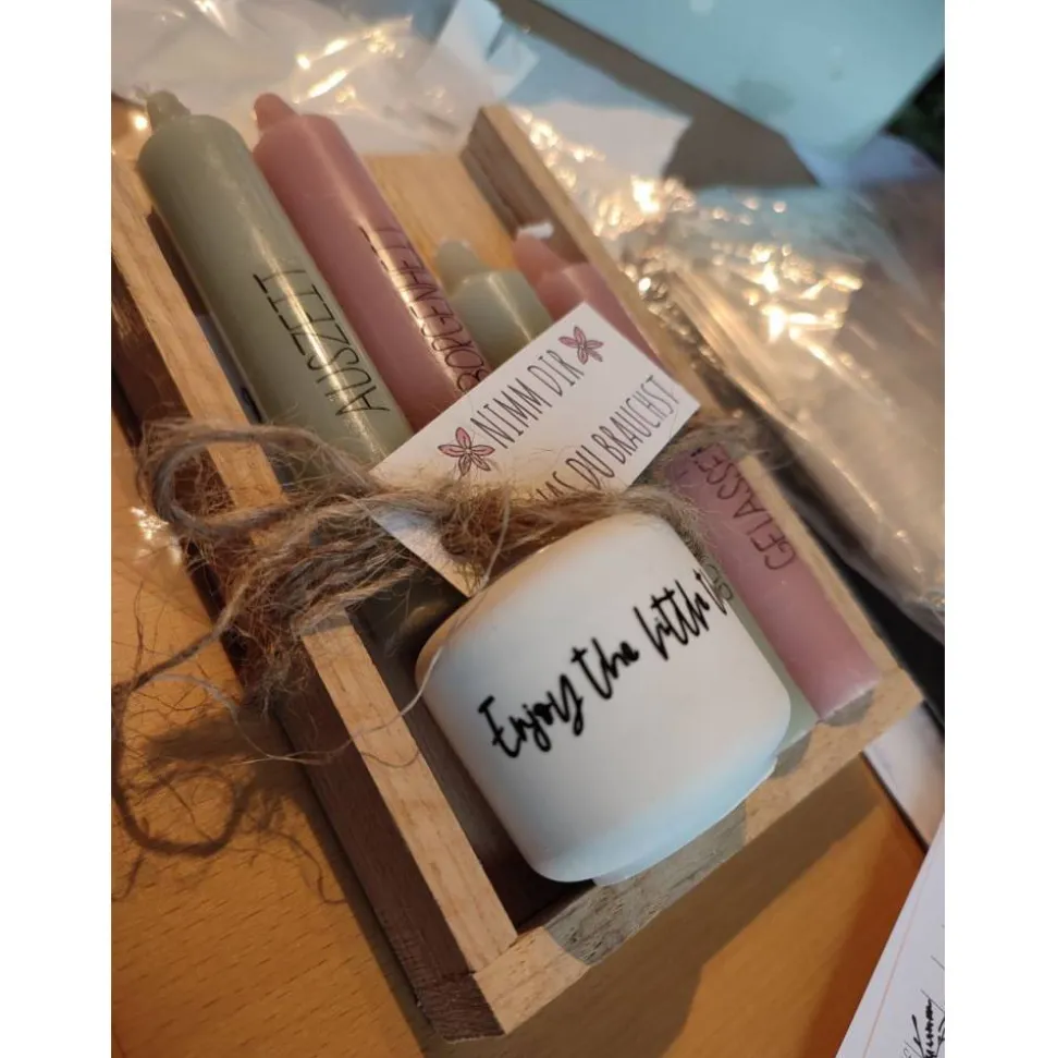 Die Texte auf den Kerzen sind auf Wasserschiebefolie gedruckt und brennen ohne Rückstände mit ab.