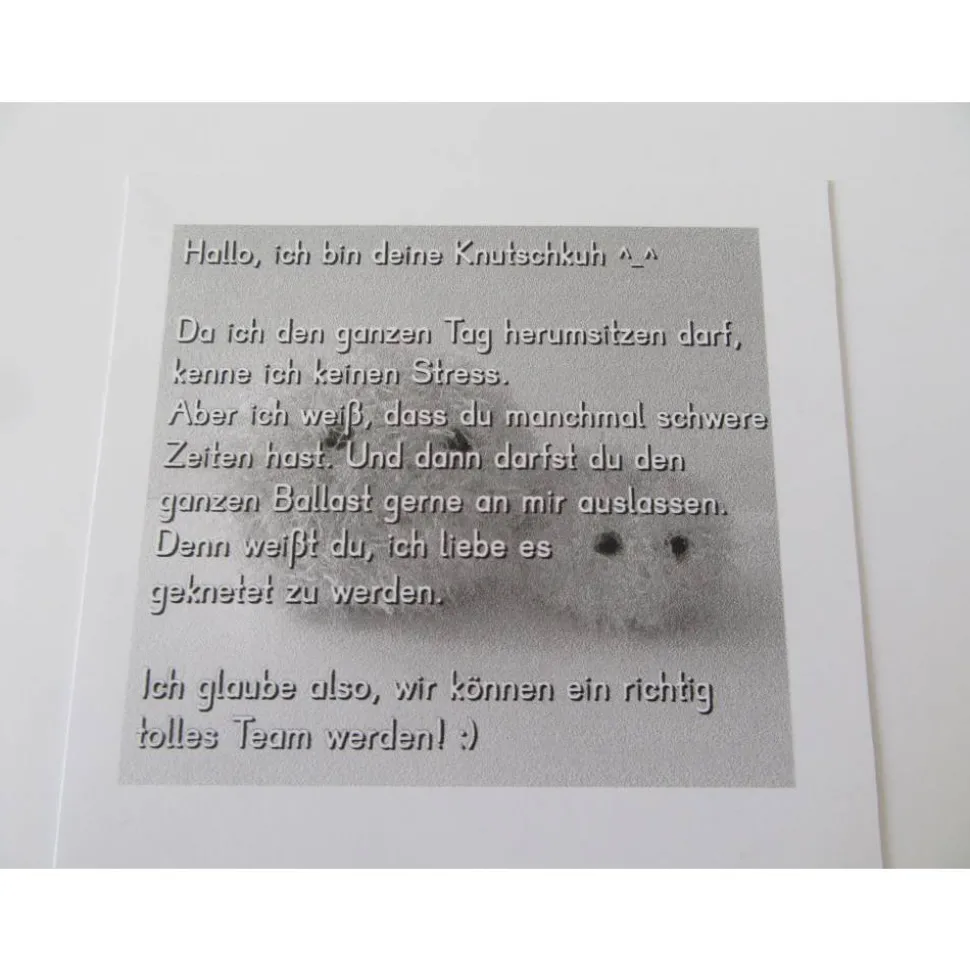 Jedes Knutschkuh-Set kommt mit einer lieben Botschaft zu Ihnen nach Hause, gerne kann der Text auch individuell auf den Beschenkten abgestimmt werden, indem dieser z.B. direkt angesprochen wird!