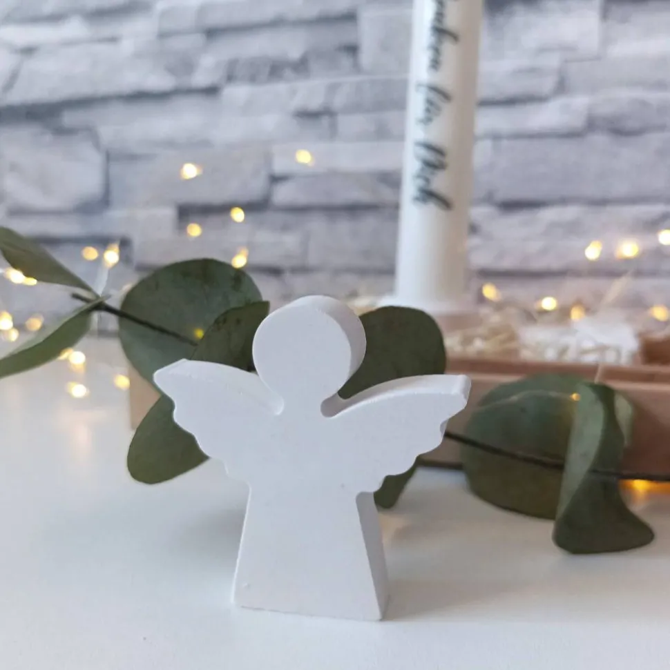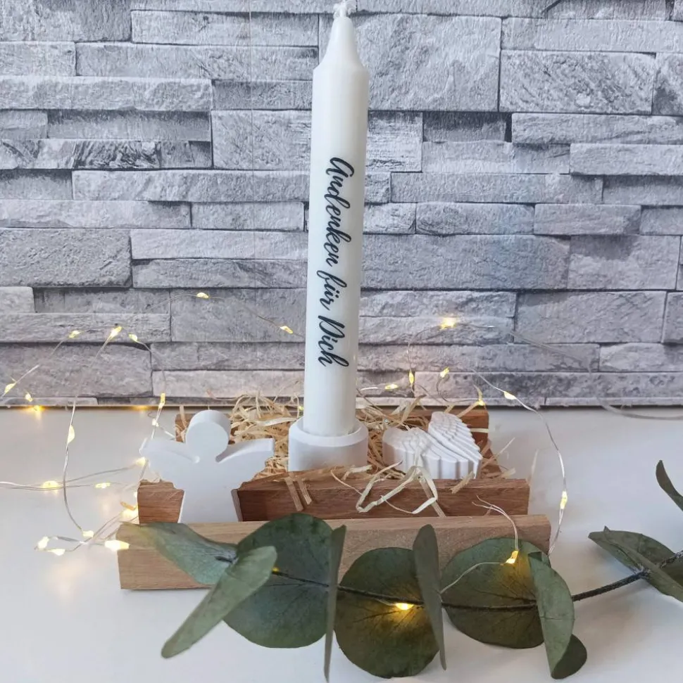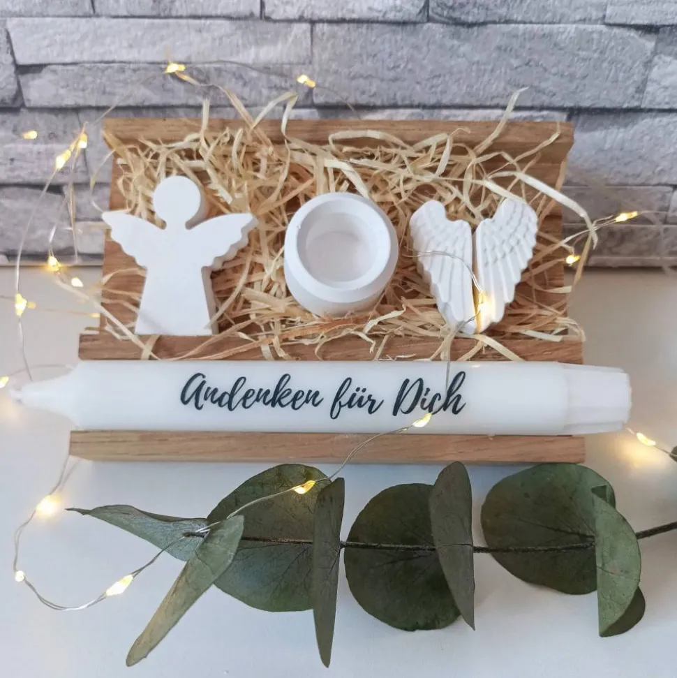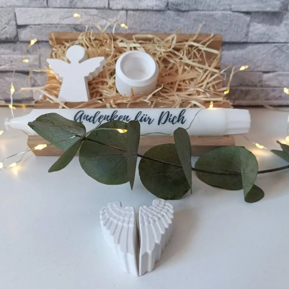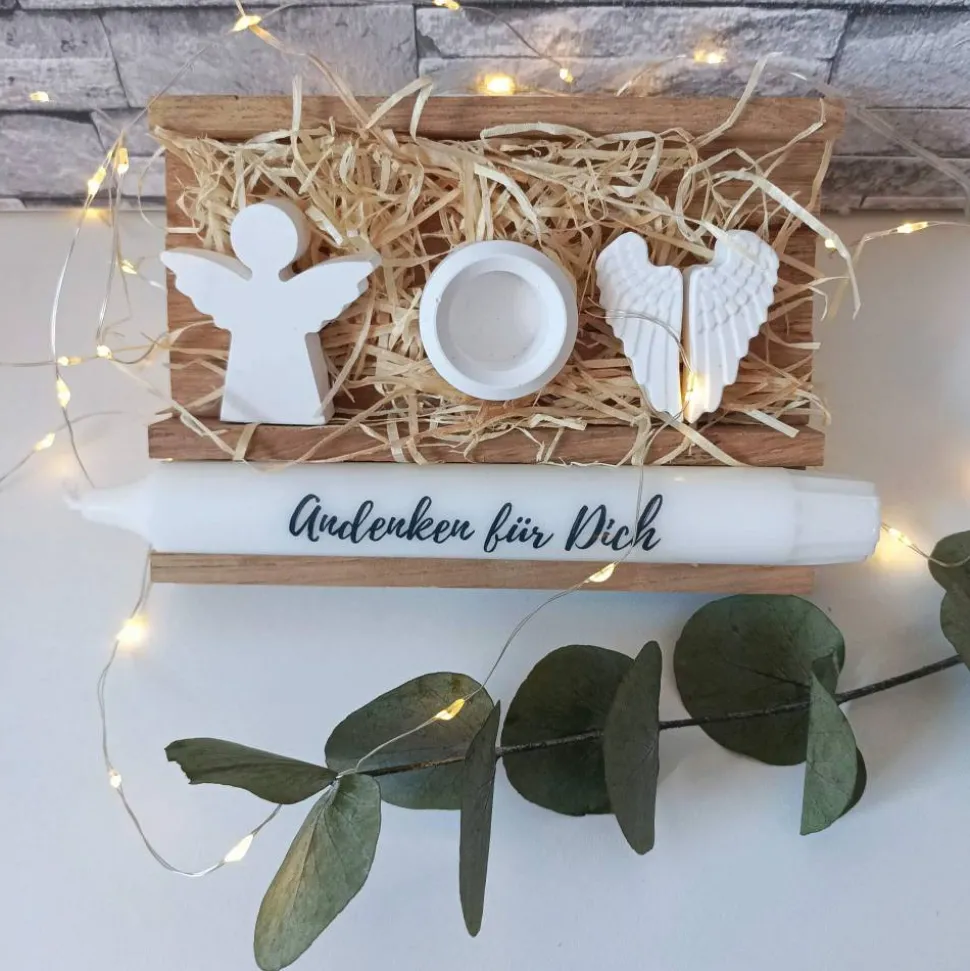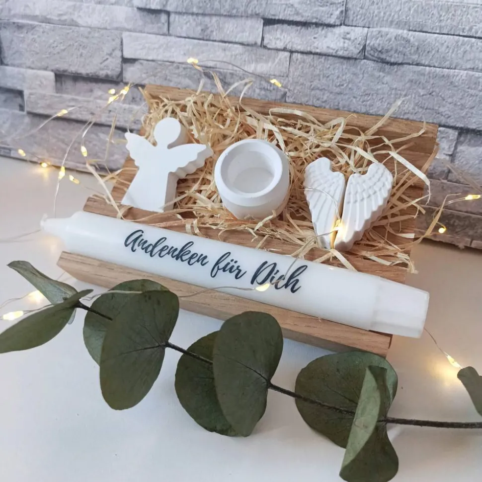 Die Geschenkbox Andenken enthält eine Kerze mit dem Spruch „Andenken für Dich“, einen passenden Kerzenhalter, einen schützenden Engel sowie zwei zarte Flügel aus Raysin. Jedes Element wurde mit viel Sorgfalt handgefertigt und ist somit ein Unikat, das emotionale Nähe und Trost spendet. Die dezente weiße Farbe und das feine, geruchsneutrale Gießpulver Raysin oder Keraflott verleihen der Deko eine besonders sanfte Ästhetik.