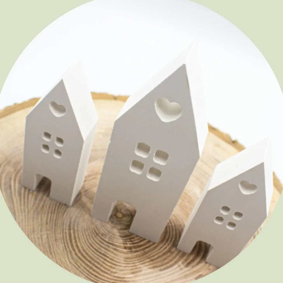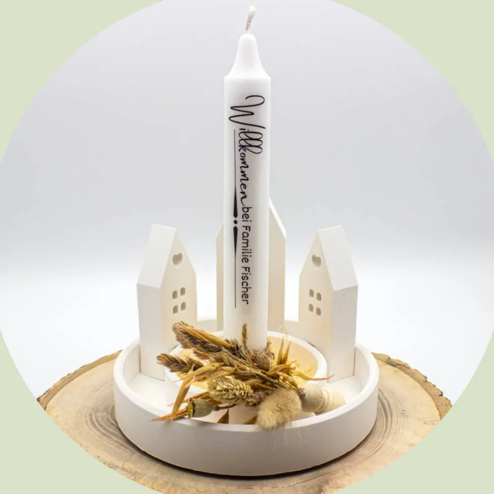 Dieses Geschenk-Set enthält nicht nur einen Kerzenhalter, sondern auch drei wunderschöne handgegossene Häuser. Zwei davon sind klein und eines ist etwas größer. Sie sind aus dem gleichen natürlichen Calciumsulfat wie der Kerzenhalter gefertigt. Die drei Häuser passen perfekt in die äußere Rille des Kerzenhalters und symbolisieren die Geborgenheit eines Zuhauses.
