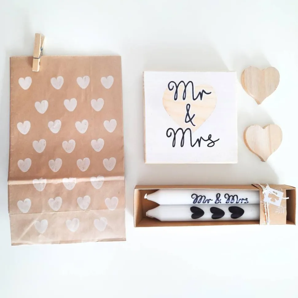 Holzschild + 2 Kerzen + 2 Herzen + Geschenktüte mit Klammer