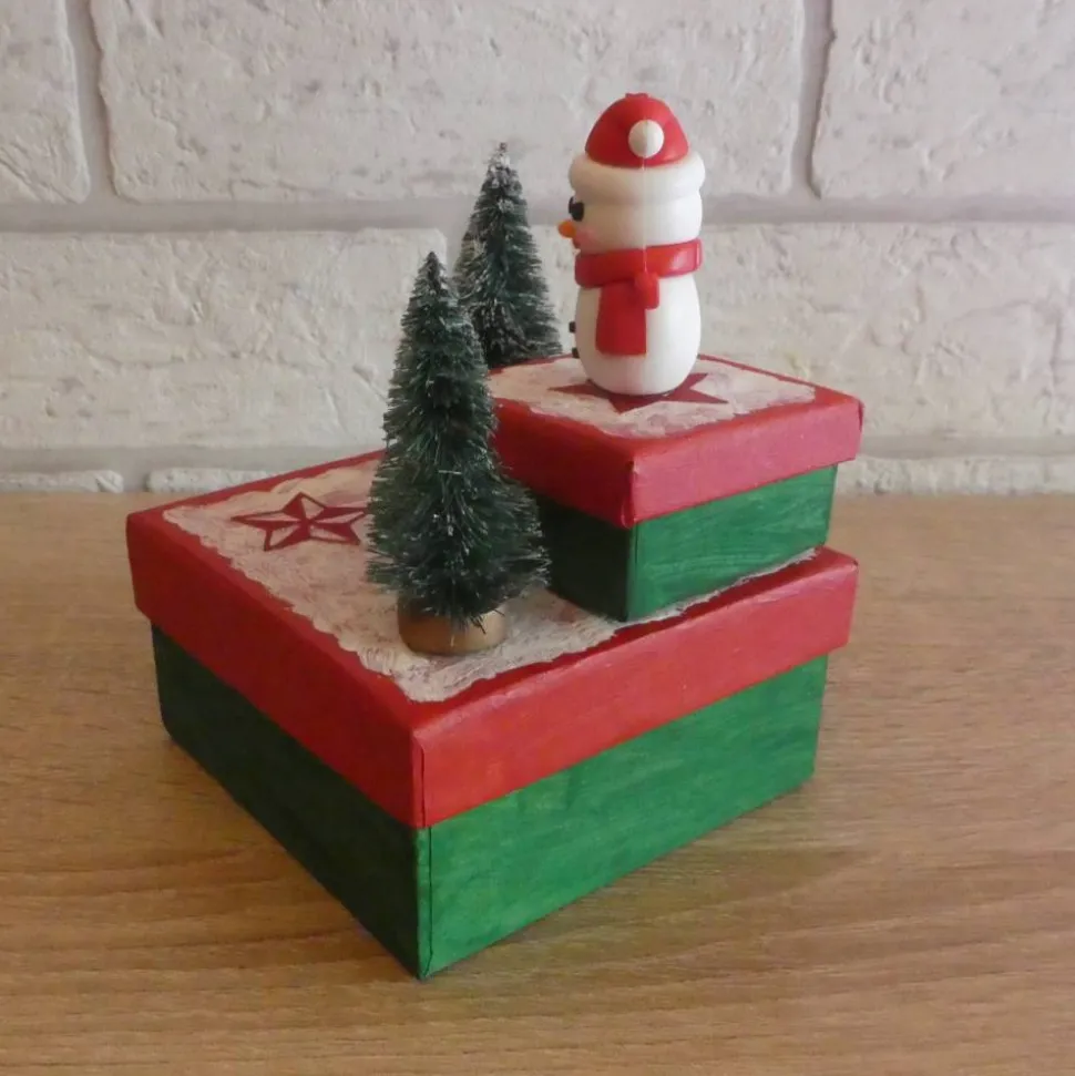 Die Geschenkverpackung besteht aus zwei aufeinandergeklebten, bemalten und verzierten Pappschadchtel mit Schneemann und Tannenbäumen