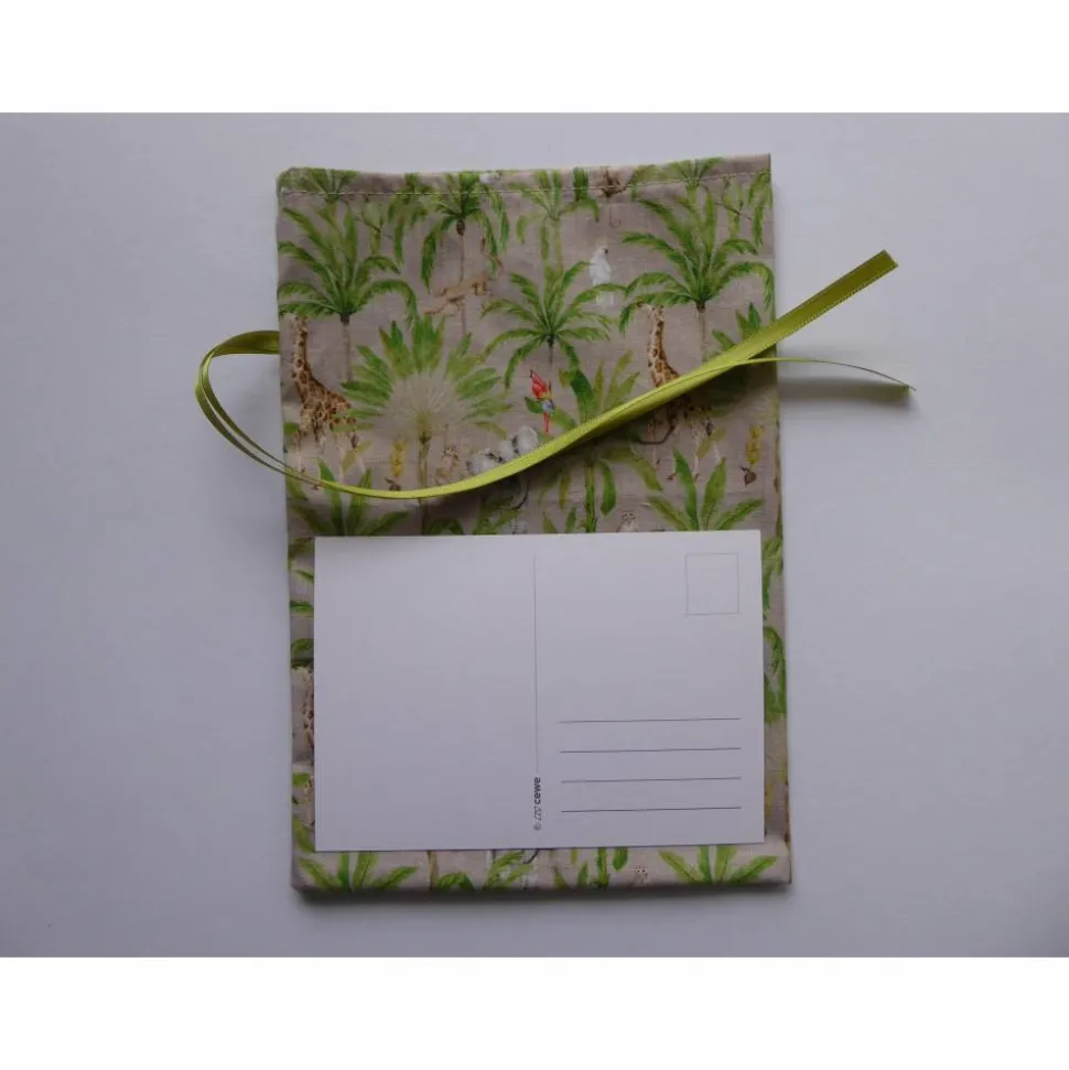 Aus Baumwollstoff in beige mit Palmen und wilden Tieren (Giraffe, Elefant, Affe, Kakadu, Papagei).