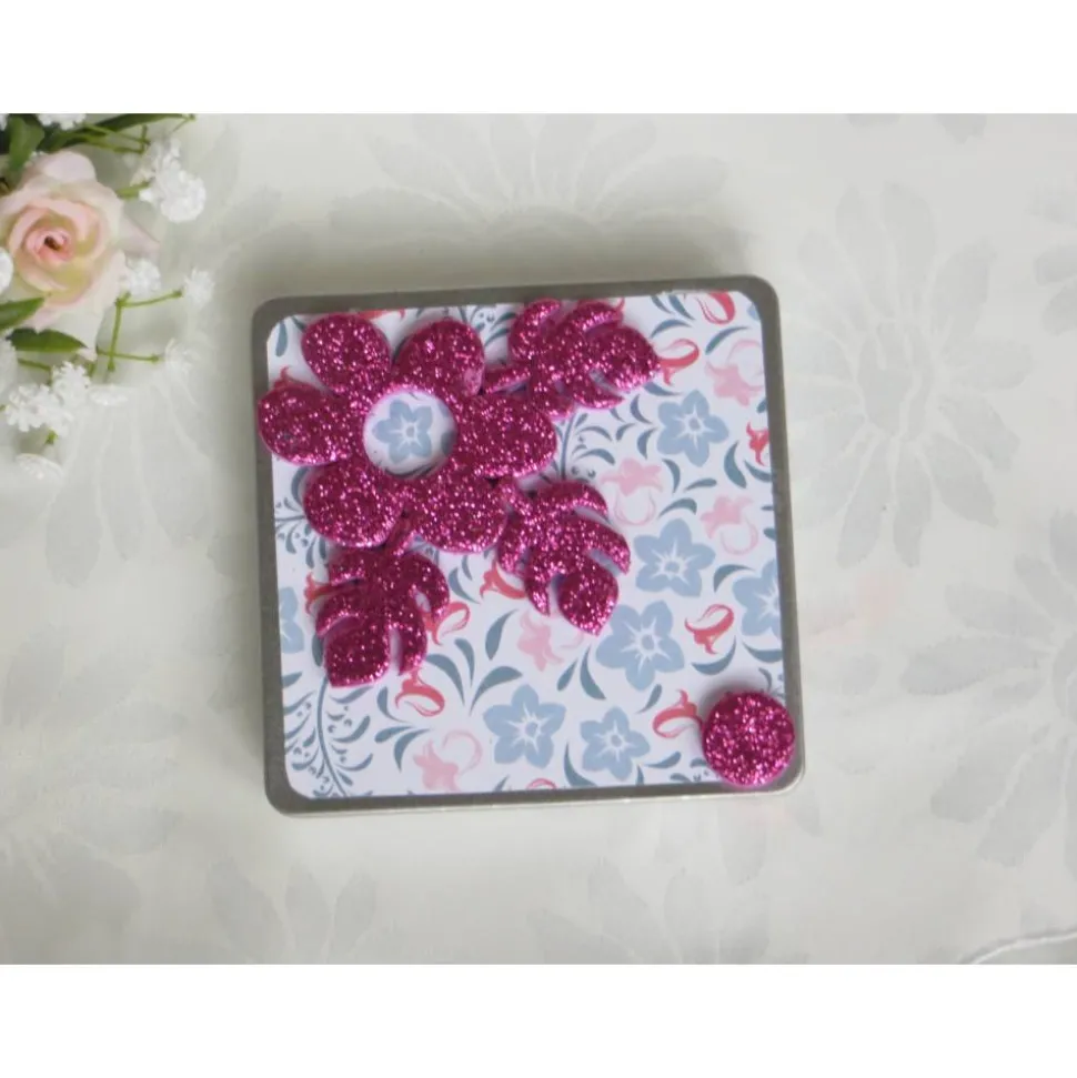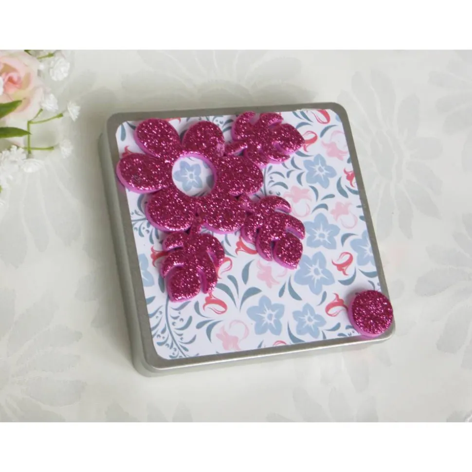 Die Schokoladendose, Geschenkverpackung ist mit hochwertigem gemusterten Kartenkarton, gestanzten farbigen Blumenornamenten verziert.
