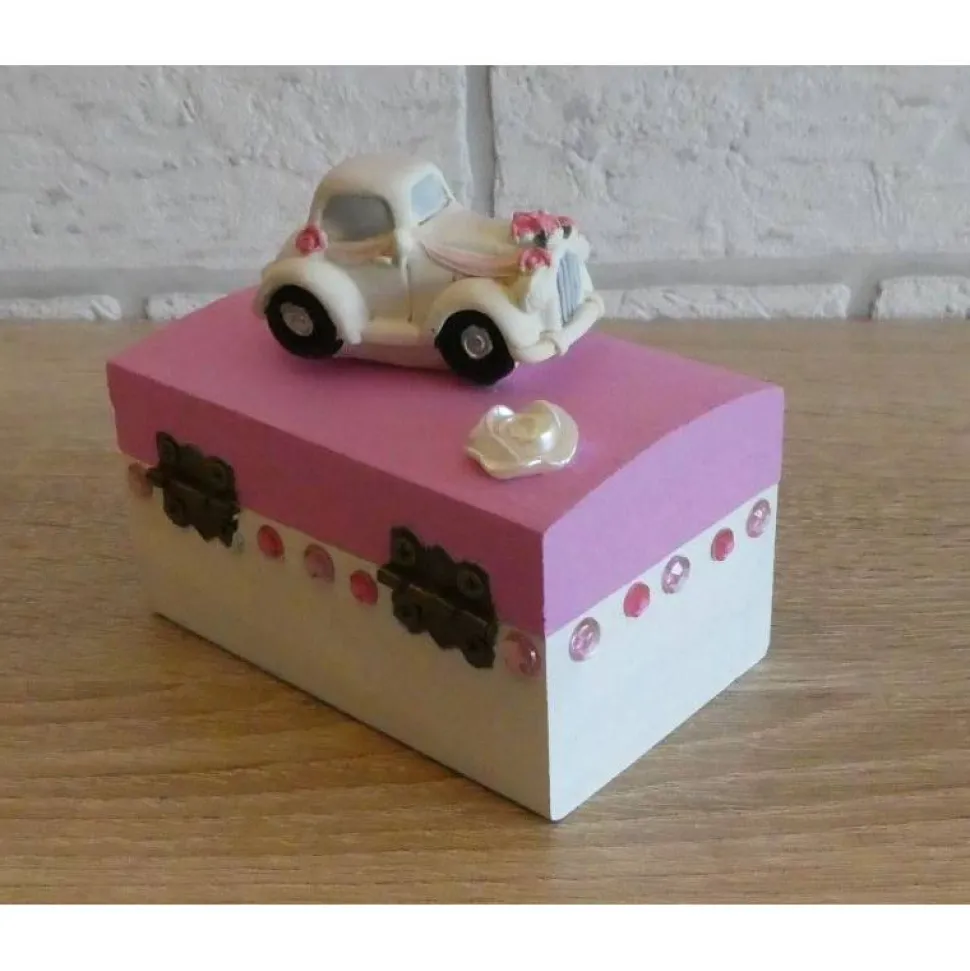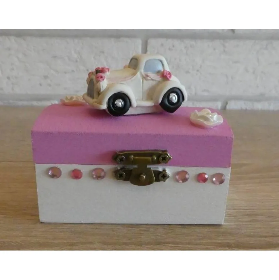 Dekoriert wurde die Truhe mit einem Hochzeitsauto und mit Strassteinen und Kunststoffblumen verziert.