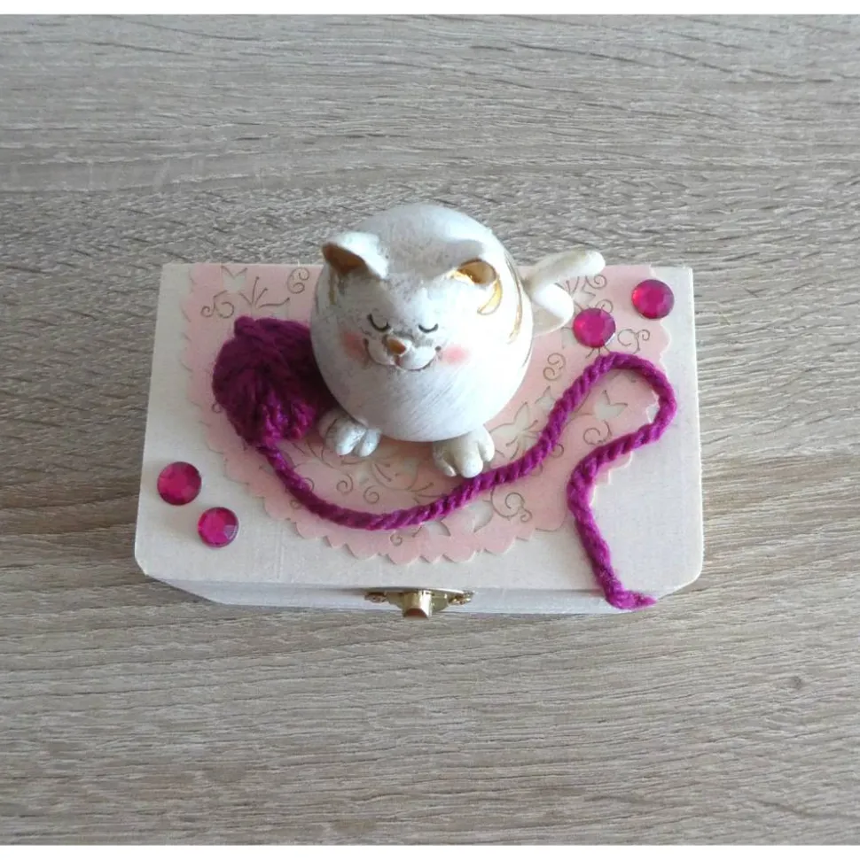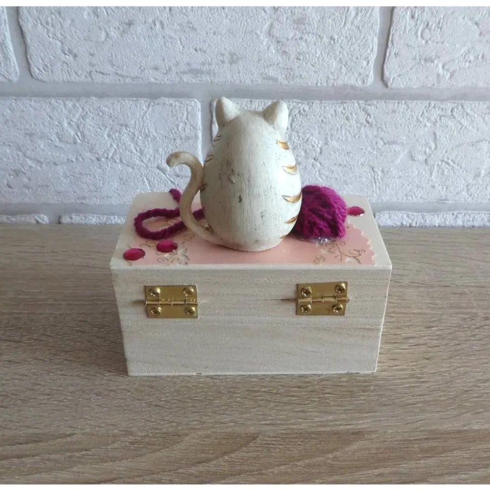 Dekoriert wurde die Truhe mit einer Katzenfigur und einem kleinen Wollknäuel.