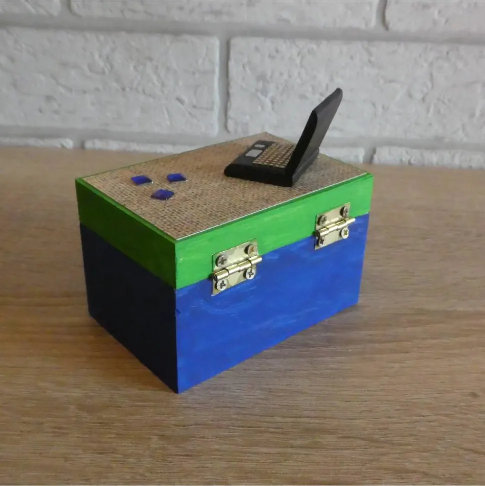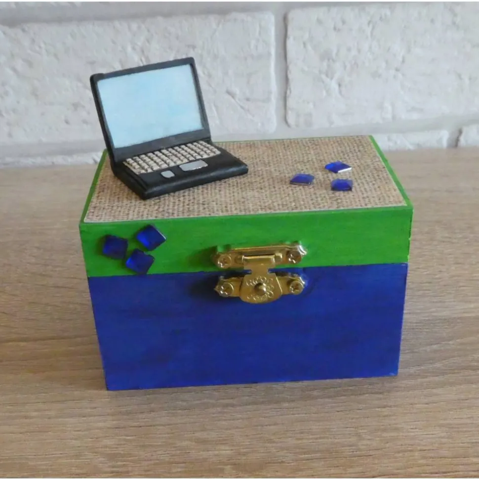 Dekoriert wurde die Truhe mit einem Laptop und Strasssteinen