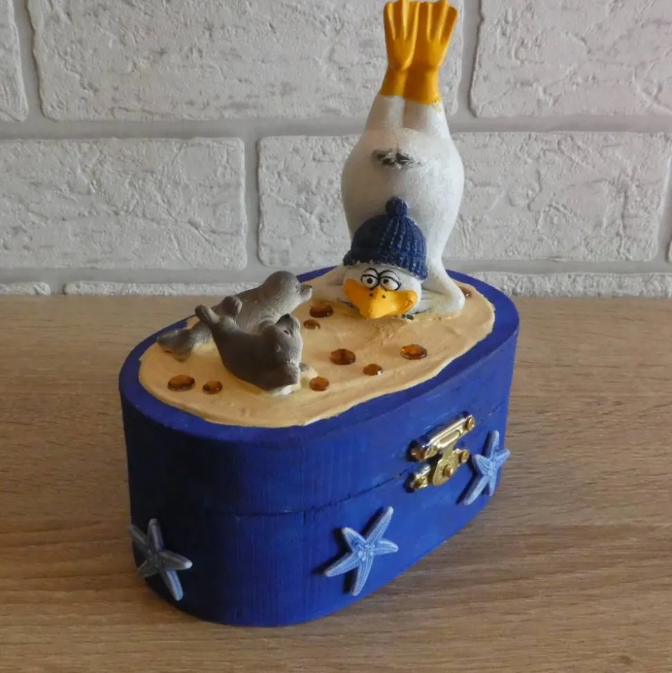 Dekoriert wurde die Truhe mit Möwe, Seehunden, Seesternen und Strasssteinen