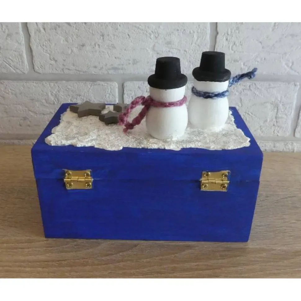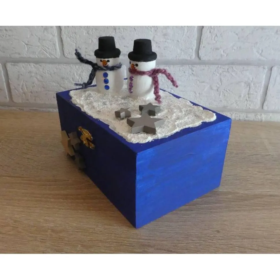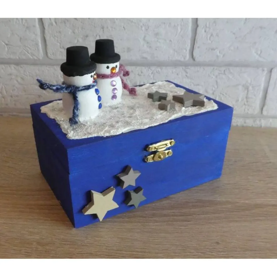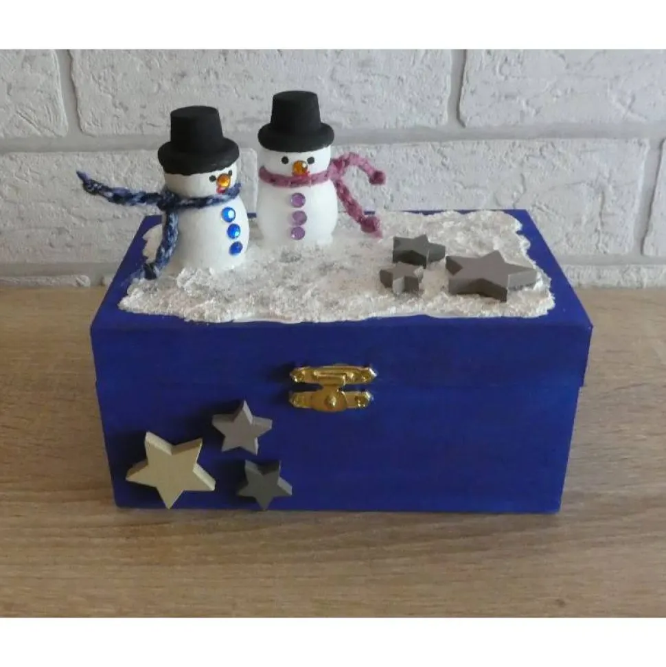 Dekoriert wurde die Truhe mit zwei Holzschneemännern, Holzsternen und Glitzer