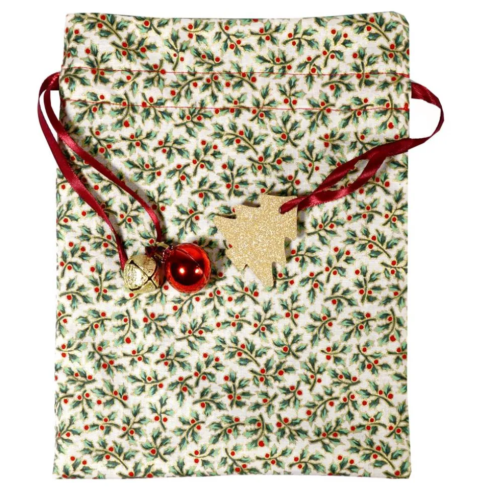 Geschenkverpackung Ilex creme für Weihnachten! Dieser no waste Geschenkbeutel aus 100% Baumwollstoff ist doppellagig genäht – außen mit stilvollem Ilexmuster in creme, rot, grün und gold, innen mit grünem Unistoff.