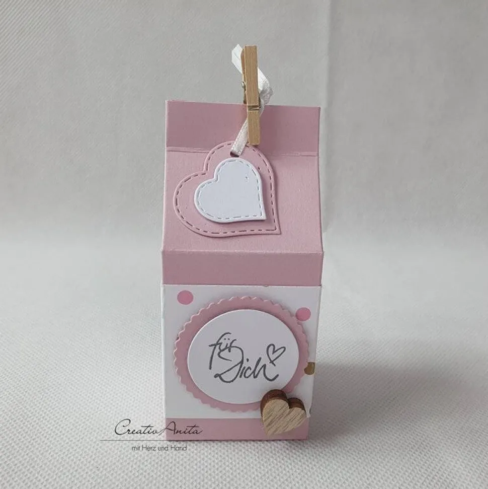 Die Milchtütenverpackung wird durch die kleine weiße Klammer verschloßen und kann ganz einfach von Ihnen befüllt werden.