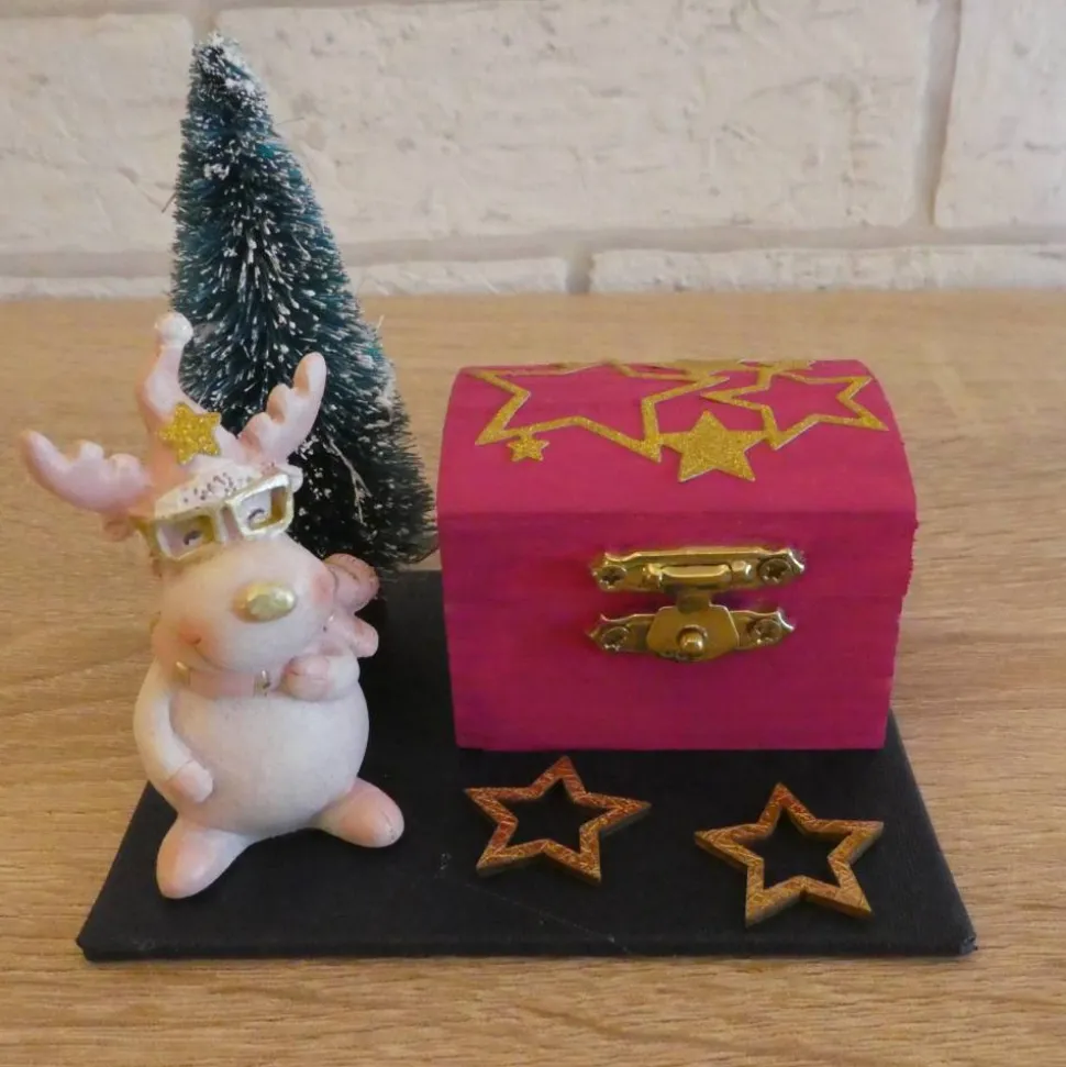 Die Geschenkverpackung besteht aus einer bemalten Pappschacht mit Verzierungen (Schneemann, Baum, Sterne)