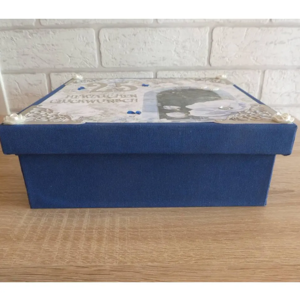 Die Geschenkverpackung besteht aus Pappe, Papier und Buchleinen und wurde mit einer 25 und dem Schriftzug „Herzlichen Glückwunsch“ verziert.