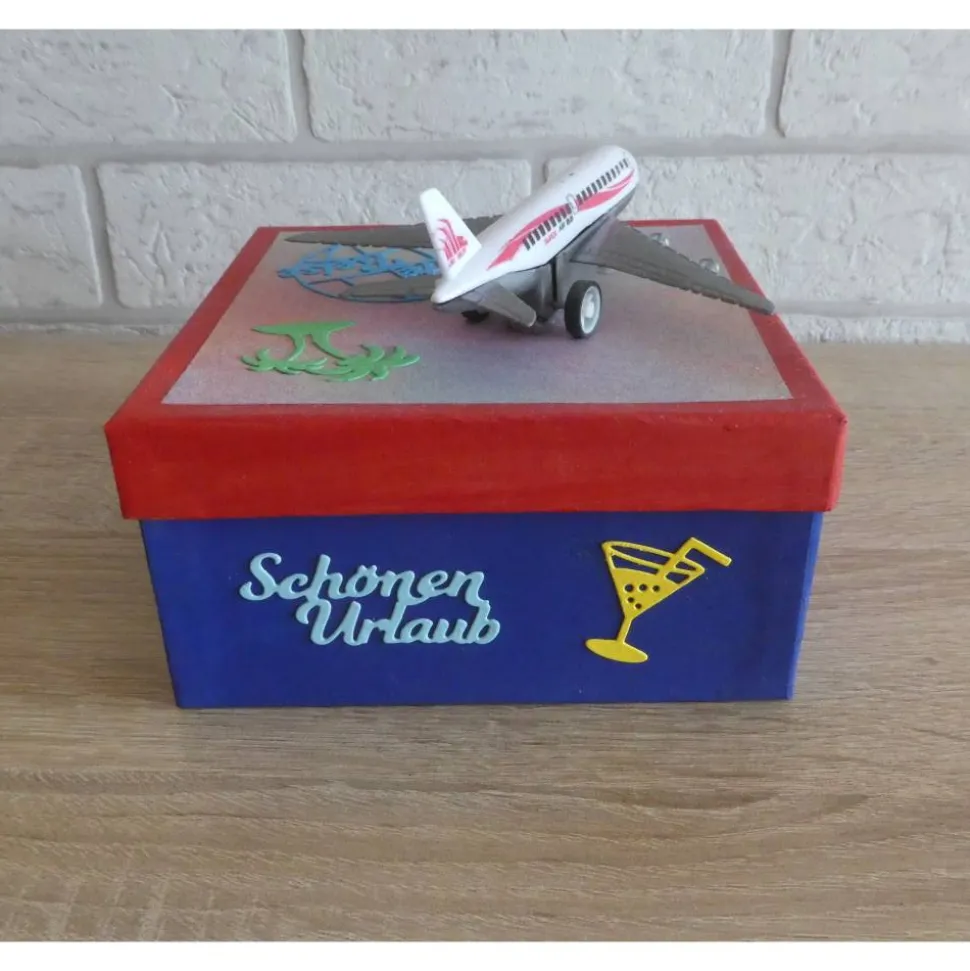 Die Geschenkverpackung besteht aus einer bemalten Pappschachtel, die ich mit einem Kunststofflugzeug und Sprüchen verziert habe.