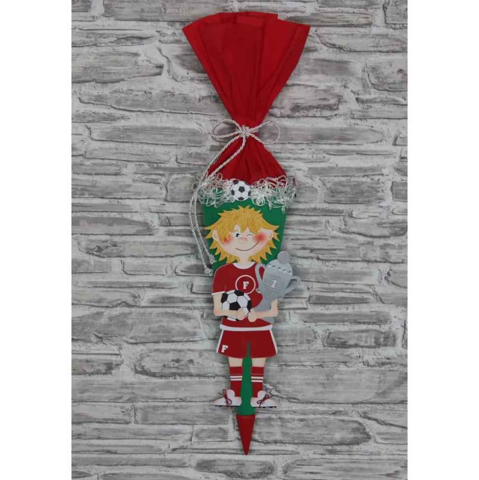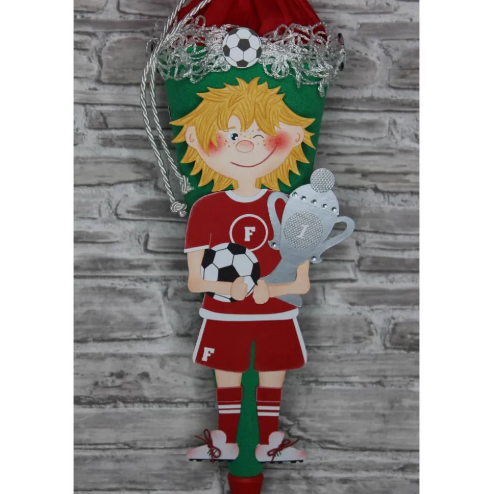 Am Manschettenrand ist ein Fußballnetz drapiert und mit Fußbällen dekoriert, diese finden sich auch rund um die kleine Schultüte wieder.