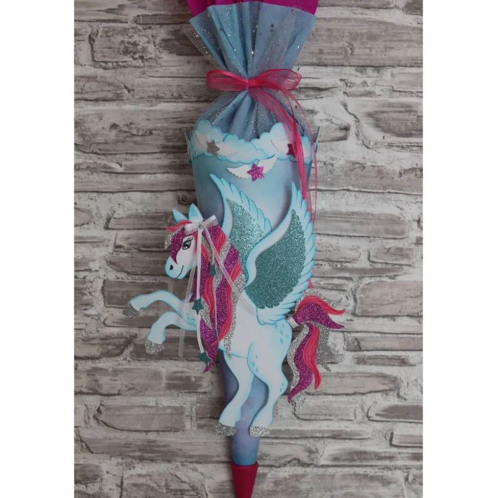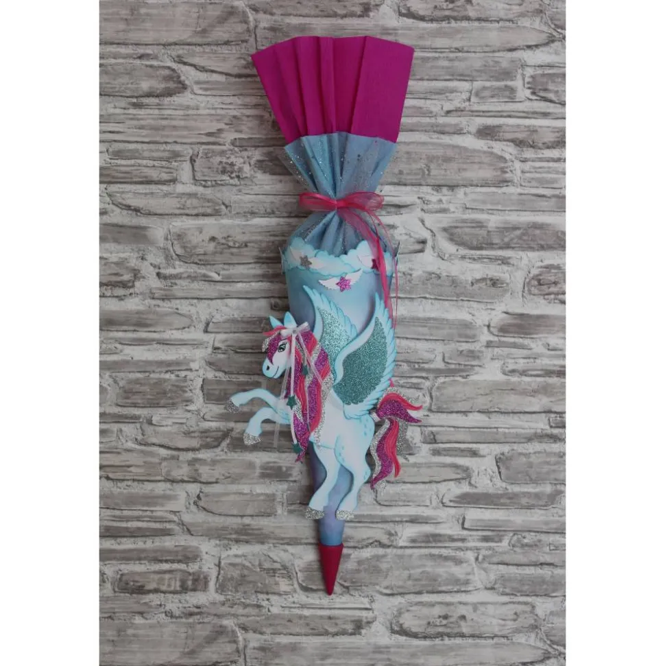 Der Schultütenrohling ist mit einem Motivkarton in Wölkchen, Aquarelloptik um klebt, eine pinkfarbene Holzspitze bildet den Abschluss.
