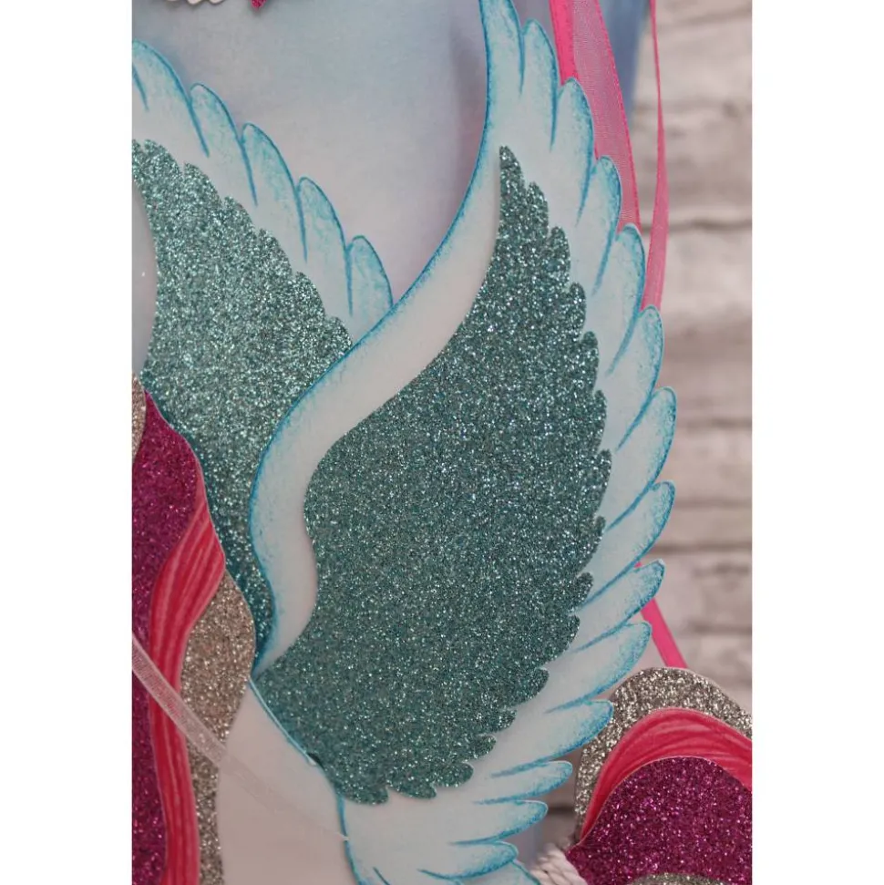 Die Hufe spiegeln den silbernen Glitterkarton wieder. Die weißen Bänder an der Mähne und dem Schweif, runden das harmonische Farbenspiel im Gesamtbild ab.