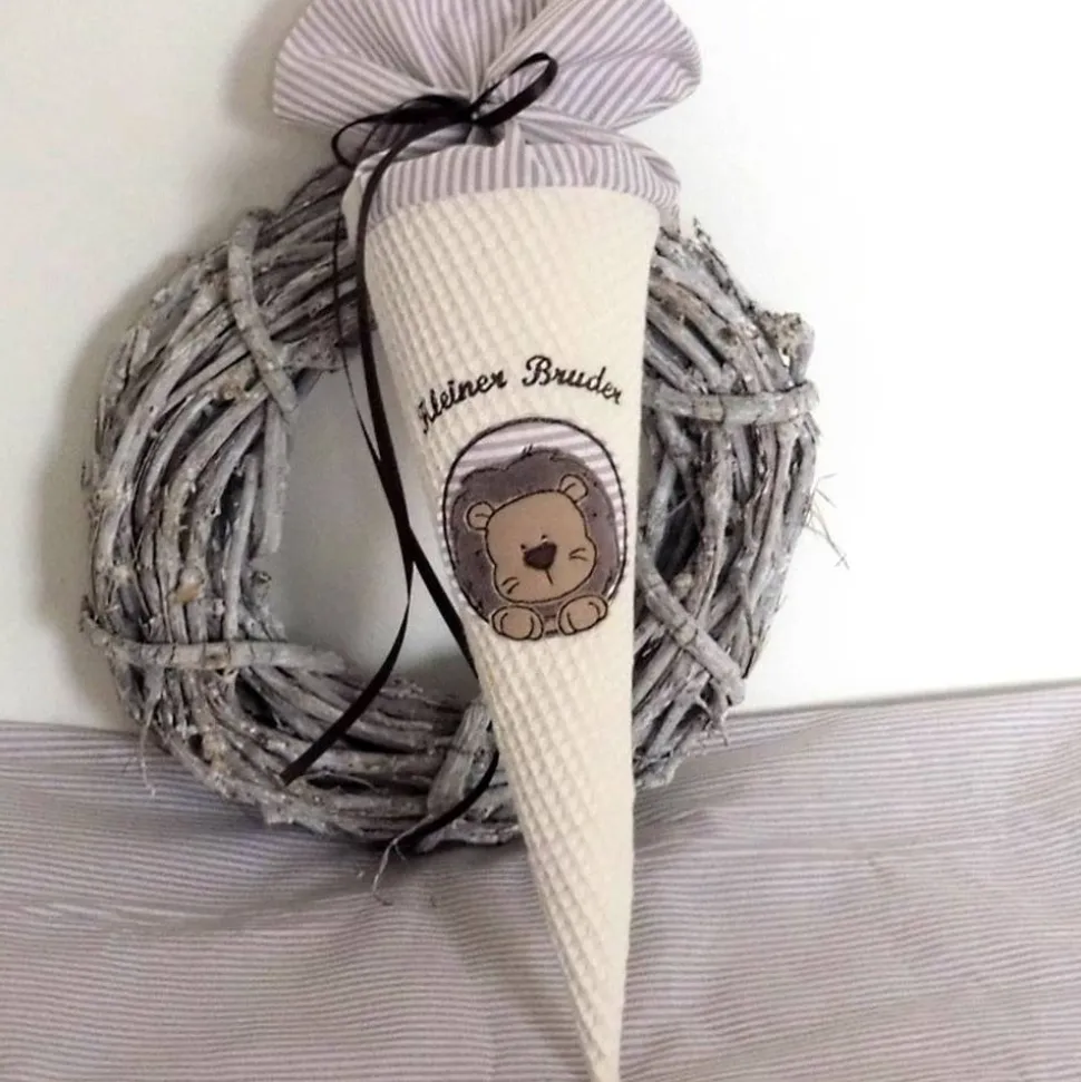 Diese kleine Zuckertüte aus hellem Waffelpiquè und gestreiftem Baumwollstoff ist mit einem niedlichen Löwen bestickt, der deinem kleinen Liebling an seinem großen, aufregenden Tag sicherlich viel Löwenmut verleiht – oder kommt dein Schatz vielleicht in die KiTagruppe bzw. Schulklasse der Löwen … oder ist im Sternzeichen der beeindruckenden Großkatze geboren?