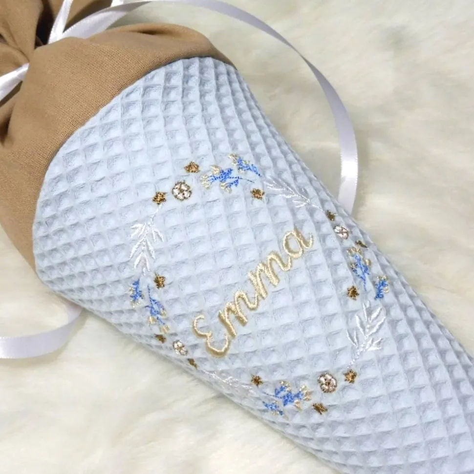 Diese liebevoll genähte Zuckertüte besteht aus rosa Waffelpiquè und einem Uni-Baumwollstoff in altrosa. Das Highlight: Der zauberhafte Blumenkranz und der individuell bestickte Name machen jede Tüte zu einem einzigartigen Erinnerungsstück.