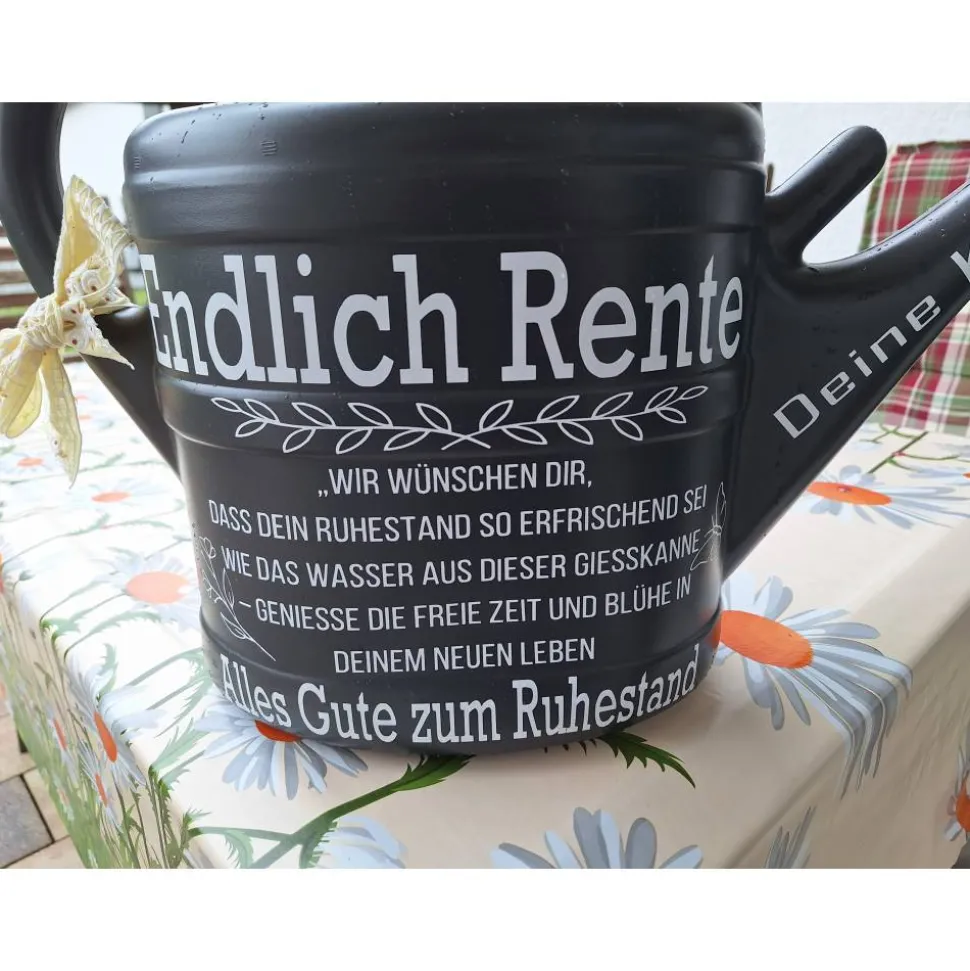 – verziert wird die Kanne von mir mit einem selbst erstellten, weißen Vinylaufkleber mit dem abgebildeten Text „Endlich Rente