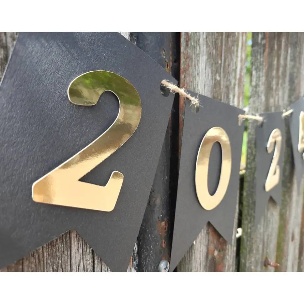 Die einzelnen Wimpel sind 13,5 cm hoch und 9,5 cm breit. Die Grundgirlande hat somit etwa eine Länge von ca. 1,20m. Die Buchstaben und Zahlen sind aus goldenem Spiegelkarton und glitzern je nach Lichteinfall.