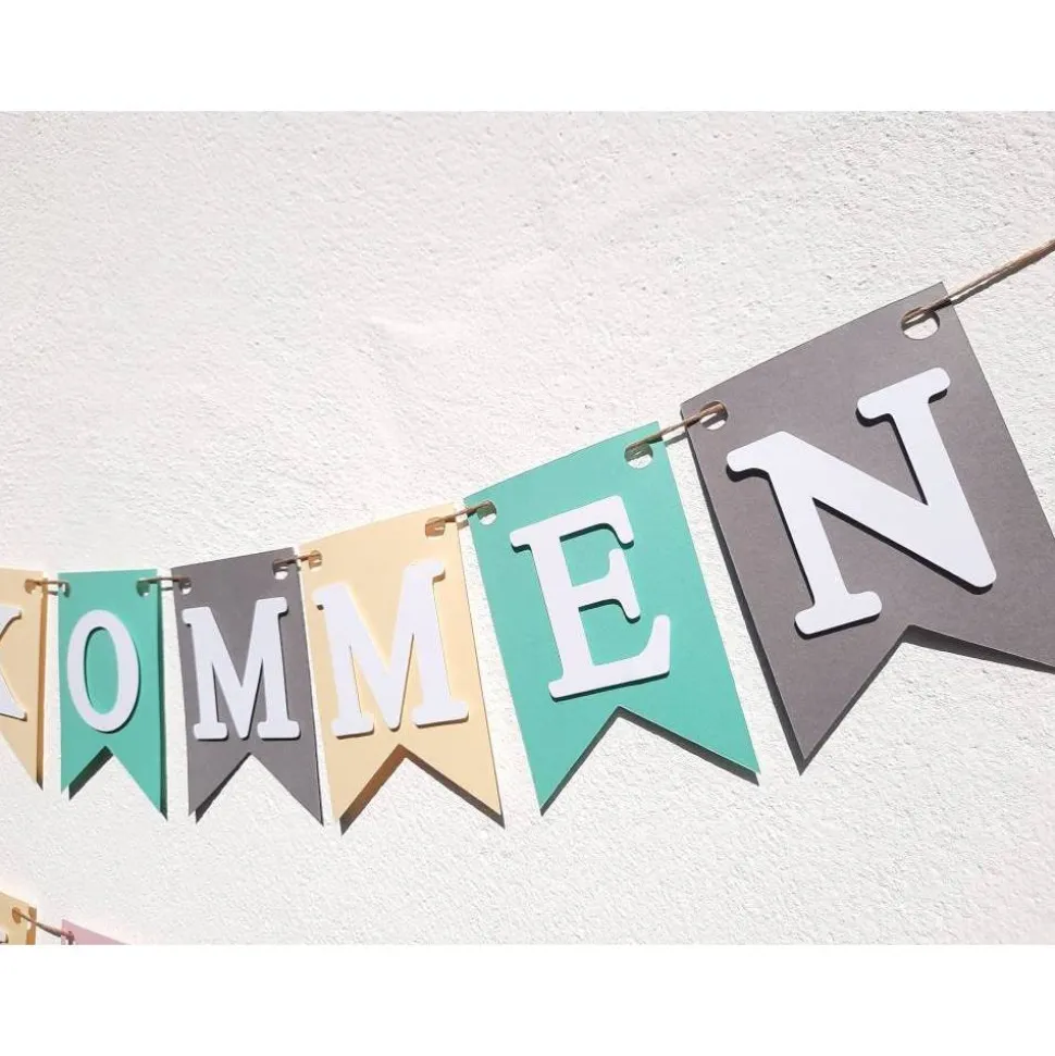 Auf Wunsch kann die Girlande personalisiert werden. Hierfür bitte die Grundgirlande „Willkommen“ auswählen und die gewünschte Buchstabenanzahl hinzufügen.