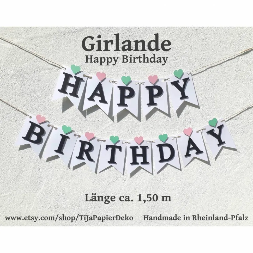 Die einzelnen Wimpel sind etwa 13,5 cm hoch und 9,5 cm breit. Durch die aufgesetzte Schrift hat die Girlande einen besonderen 3 D Effekt.