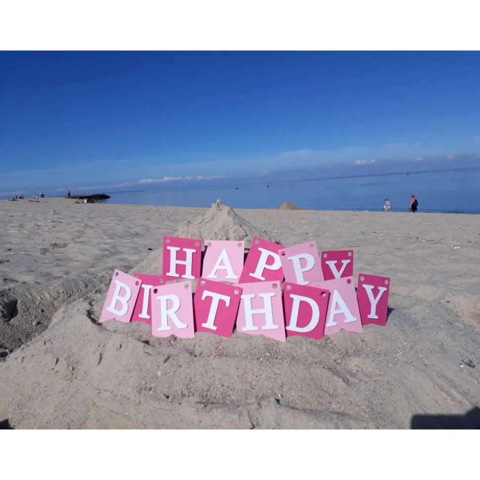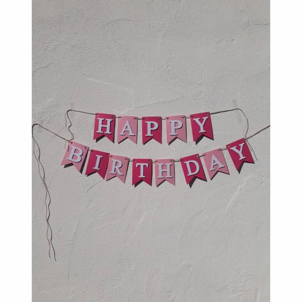 Liebevoll handgefertigte Happy Birthday Girlande in Pink – und Rosatönen mit weißer Schrift. Etwa 1,50 m lang. Besonderer 3D Effekt durch aufgesetzte Schrift. Die einzelnen Wimpel sind aus hochwertigem Papier gefertigt und jeweils ca. 13,5 cm hoch und 9,5 cm breit. Eine ausreichend lange Schnur zum Befestigen ist im Lieferumfang enthalten.
