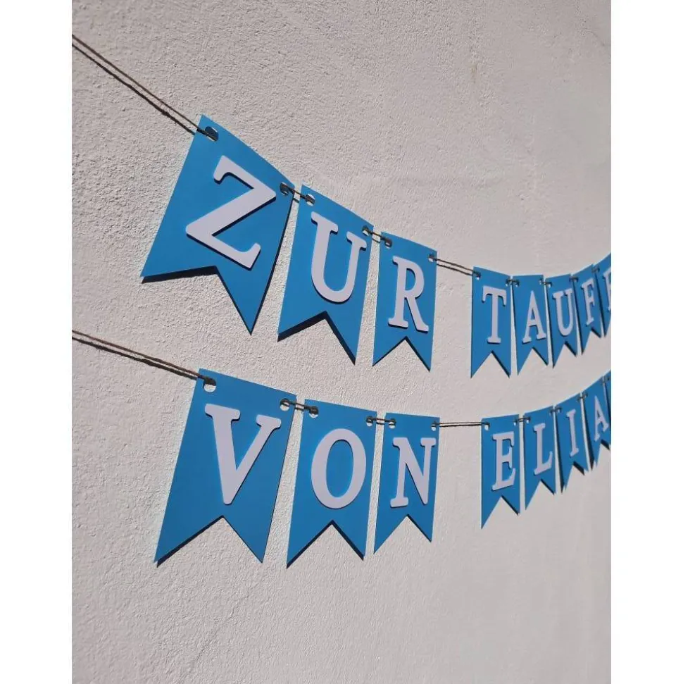 Wunderschöne Girlande zur Taufe. Personalisiert mit dem Namen des Taufkindes. Bitte hierfür die entsprechende Buchstabenanzahl auswählen und den gewünschten Namen angeben. In pastellblau mit klarer weißer Schrift. Aus hochwertigem Karton und liebevoll von Hand zusammen gesetzt.