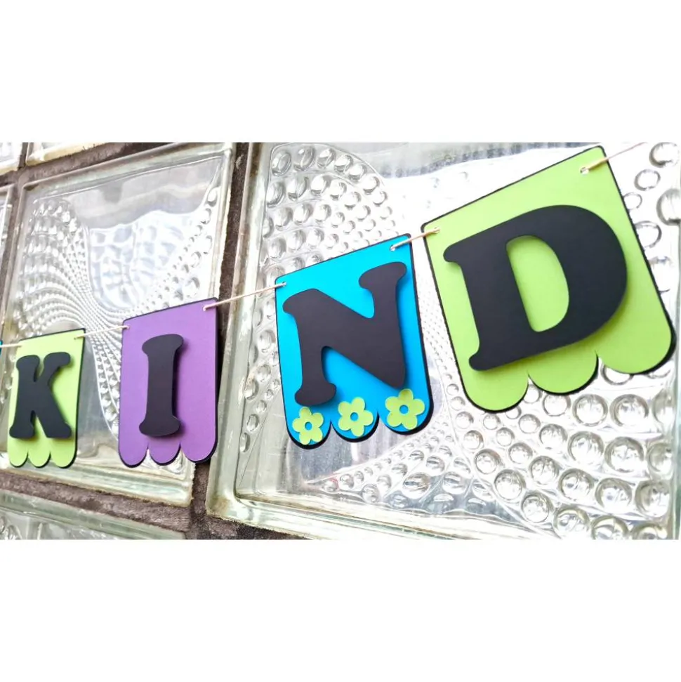 Die großen schwarzen Buchstaben auf jedem Wimpel sind in einem 3D Effekt, was ihnen eine plastische Präsenz verleiht – fast so, als würde sie aus dem Papier herauskommen und den Betrachter direkt ansprechen. Einige Wimpel sind zusätzlich mit zarten Blumenverzierungen geschmückt, die dem Gesamtbild eine verspielte Note geben.
