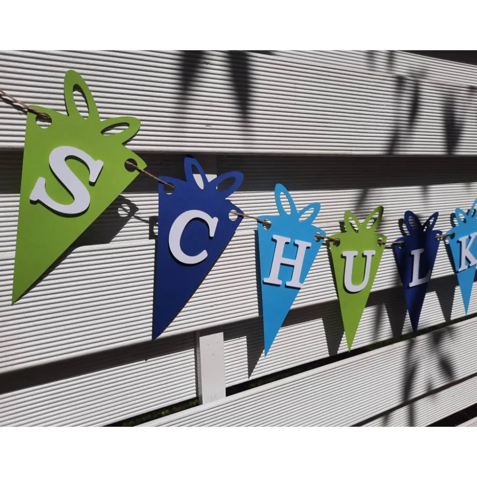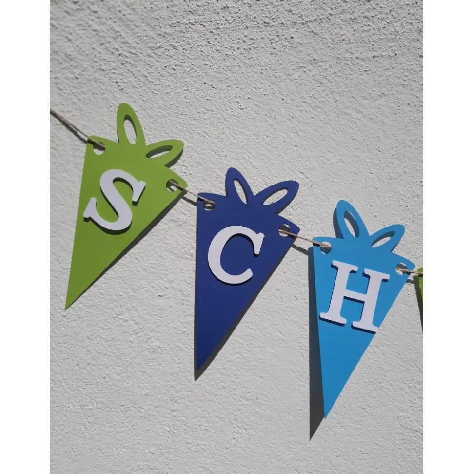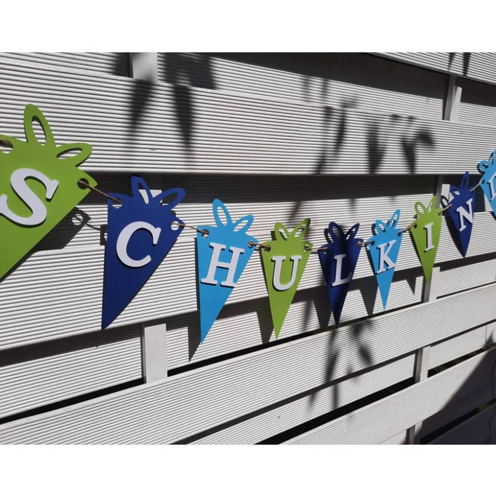 Die Wimpelkette ist in Hellgrün, Blau und Dunkelblau mit weißer aufgesetzter Schrift.