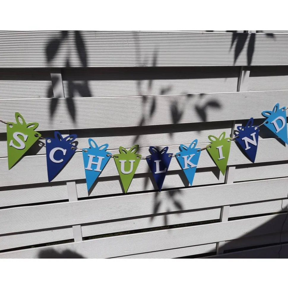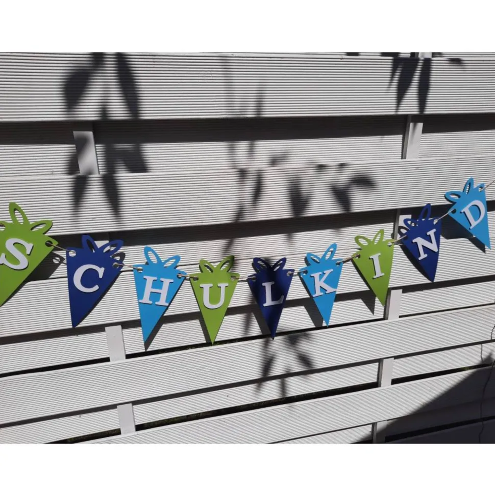 Mit unserer super niedlichen Girlande mit kleinen Schultüten und der Aufschrift „Schulkind“ kommt die richtige Deko für diesen wichtigen Tag.