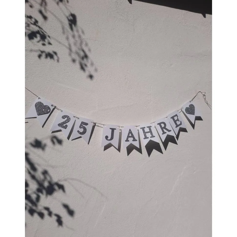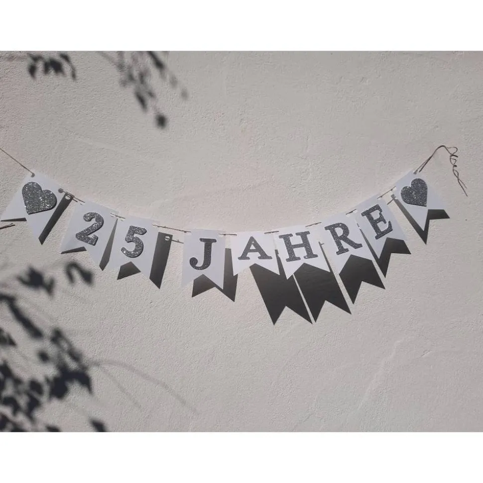 Unsere Jubiläums Girlande ist ganz edel in Weiß und Silber.