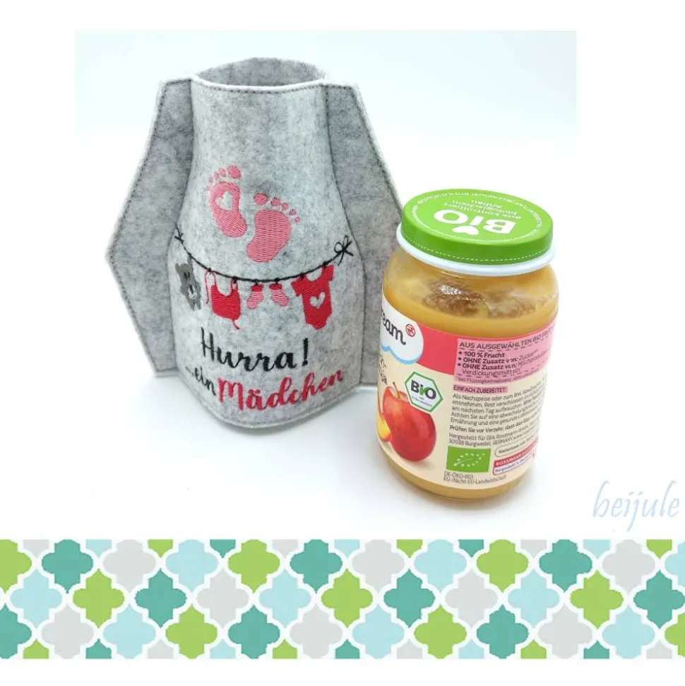 Diese Glasmanschette ist ein kleiner Allrounder. Mit einem leeren Babygläschen wird die Manschette schnell zu einer Blumenvase umfunktioniert. Oder eine nette Umverpackung für die 200 ml Sektflaschen. Gerade für Krankenbesuche ganz toll als Blumenvase geeignet oder als schnelles Geschenk zur Geburt