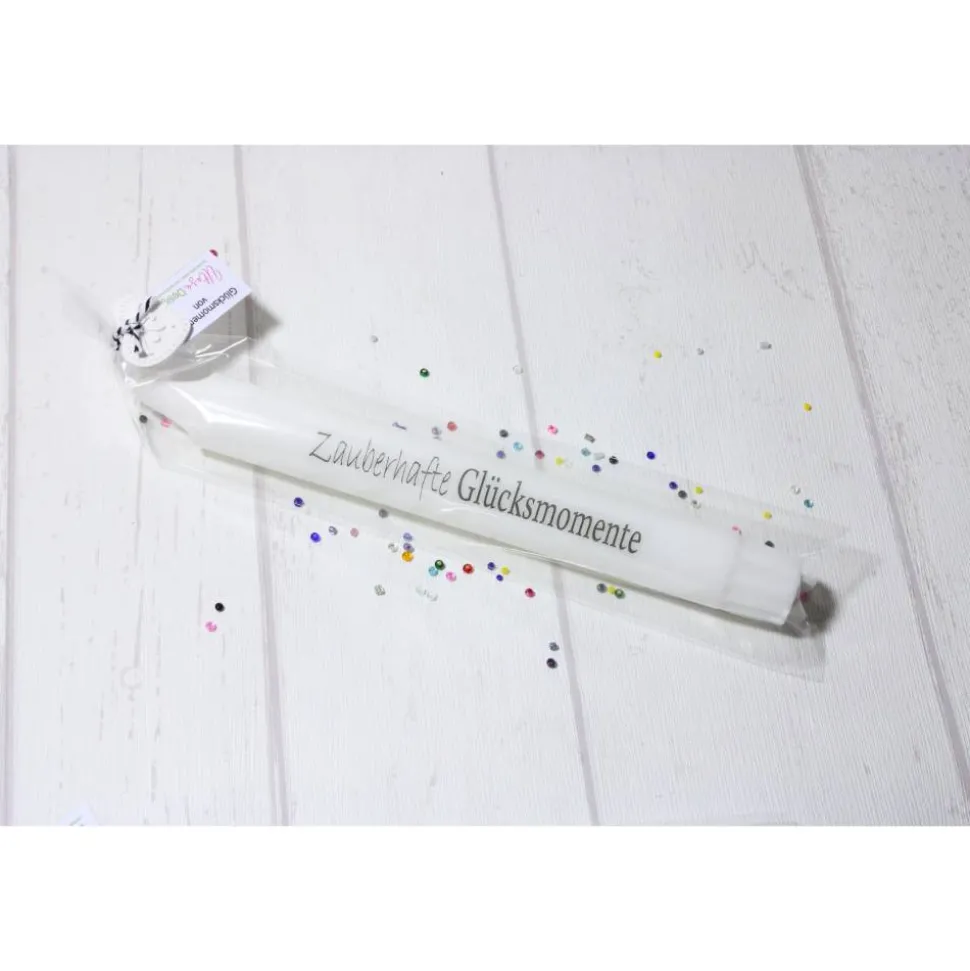 Hier ist eine von mir liebevoll, gefertigte Stabkerze in Weiß mit einem Schriftzug in Schwarz. Die Kerze wird unverpackt oder in Folie verpackt geliefert. Die liebevolle Verpackung in Folie beinhaltet noch einen Anhänger aus Raysin (das dritte Foto zeigt ein Beispiel, wie die Kerze verpackt wird). Der Anhänger kann von dem Produktfoto abweichen und ist variabel. Eine alternative Verpackung (Holz oder Karton) ist ebenfalls möglich. Meldet Euch hierzu einfach bei mir. Bei einer größeren Bestellmenge verlängert sich die Lieferzeit. Die Deko gehört nicht zum Lieferumfang, sondern dient nur der Präsentation.