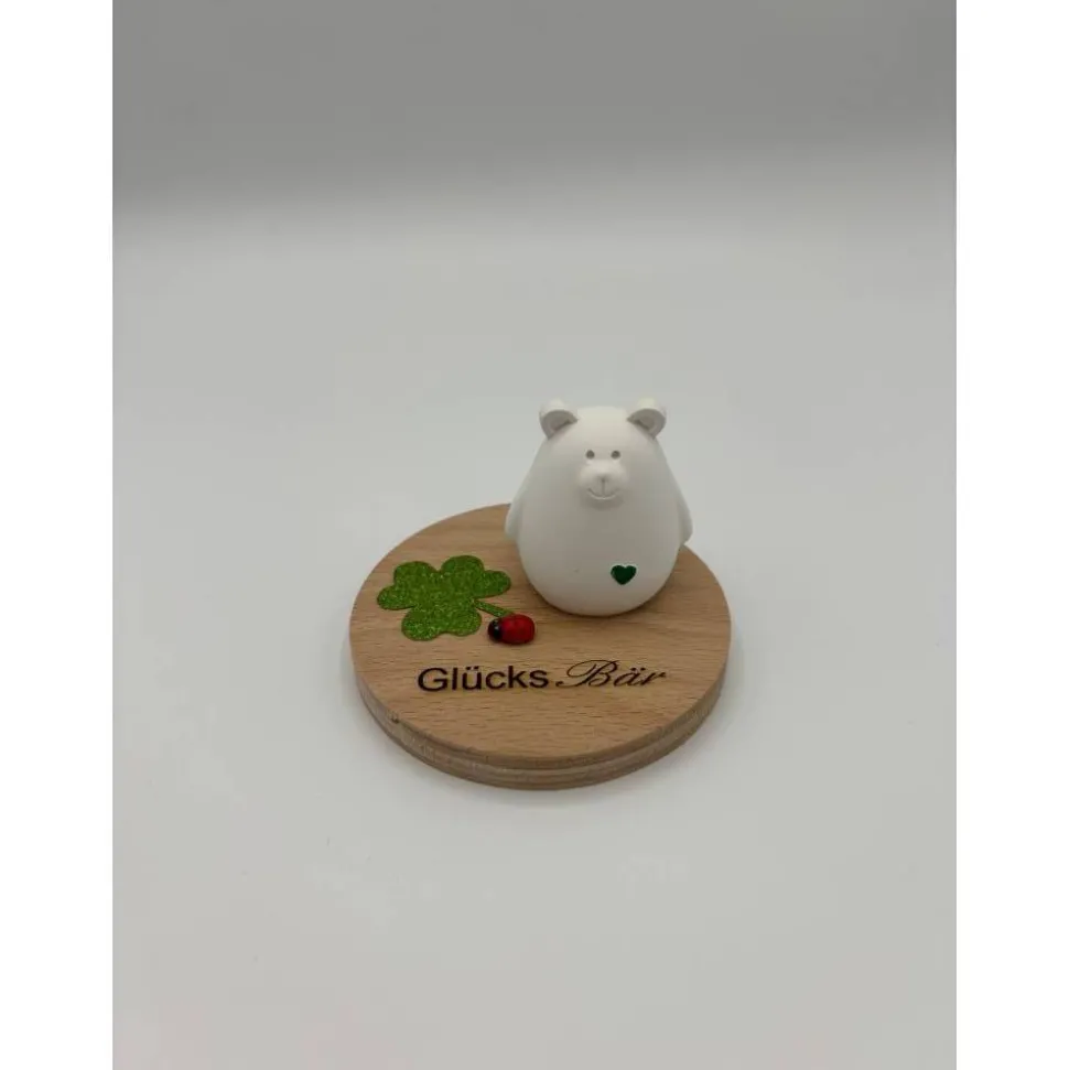 Mit dem GlücksBÄR holst du dir oder einem lieben Menschen ein einzigartiges Symbol für Glück, Freude und positive Energie nach Hause. Der schlichte weiße Bär sitzt auf einem runden Holzsockel und trägt ein grünes Herz auf der Brust. Neben ihm schmücken ein glitzerndes dreiblättriges Kleeblatt und ein roter Marienkäfer die Szene – beides klassische Symbole für Glück.