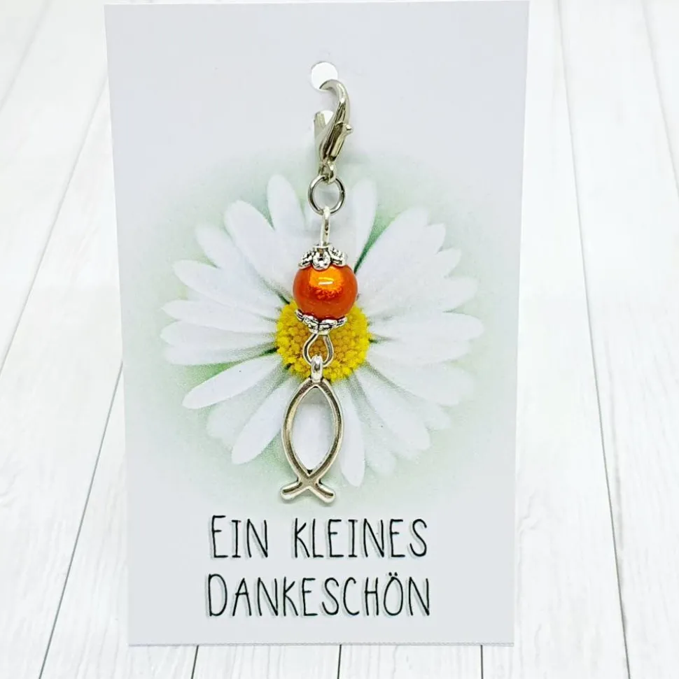 Der Anhänger misst 2cm und hat die Form eines eucharistischen Fisches. Kombiniert wird er mit einer schimmernden 3D-Acrylperle und einem praktischen Karabiner. Die Gesamtlänge beträgt ca. 4,5cm ohne Karabiner und 6cm inkl. Karabiner. Zu jedem Anhänger erhältst Du ein kleines Schmuckkärtchen, das Du aus verschiedenen Designs frei wählen kannst.