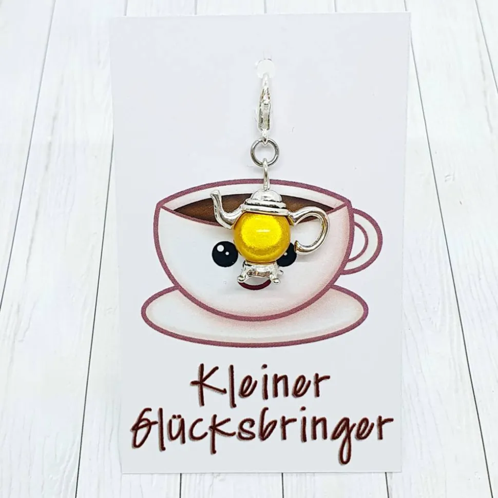 Glücksbringer Kanne silberfarben / gelb – Der perfekte Anhänger für alle, die Tee oder Kaffee lieben! Ob als kleines Mitbringsel, Gastgeschenk für Deine Feier oder als süßer Glücksbringer für Freundinnen – dieses Kännchen passt einfach immer.
