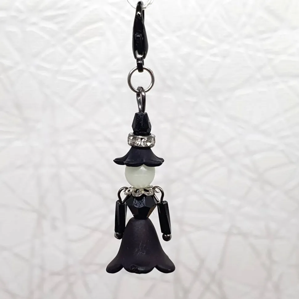 Größe und Verarbeitung: Jedes Hexlein ist ca. 3,5cm ohne Karabiner und 4,5cm inkl. Karabiner groß. Die Arme, der Oberkörper und die Hutspitze bestehen aus Glasperlen. Deshalb eignet sich die Figur perfekt als Taschenbaumler, jedoch nicht als Schlüsselanhänger.