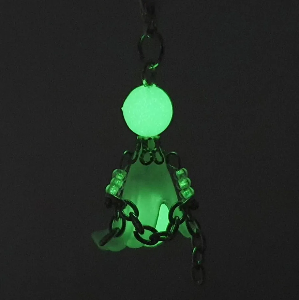 Nachts leuchtet der kleine Geist noch ein wenig nach und sorgt so für einen magischen Hingucker. Mit seiner Größe von ca. 3,5cm ohne Karabiner und 4,5cm inklusive Karabiner ist er perfekt als Taschenbaumler geeignet. Als Schlüsselanhänger ist er nur bedingt geeignet, da die Arme aus Glasperlen bestehen und am Schlüsselbund schnell Schaden nehmen könnten.